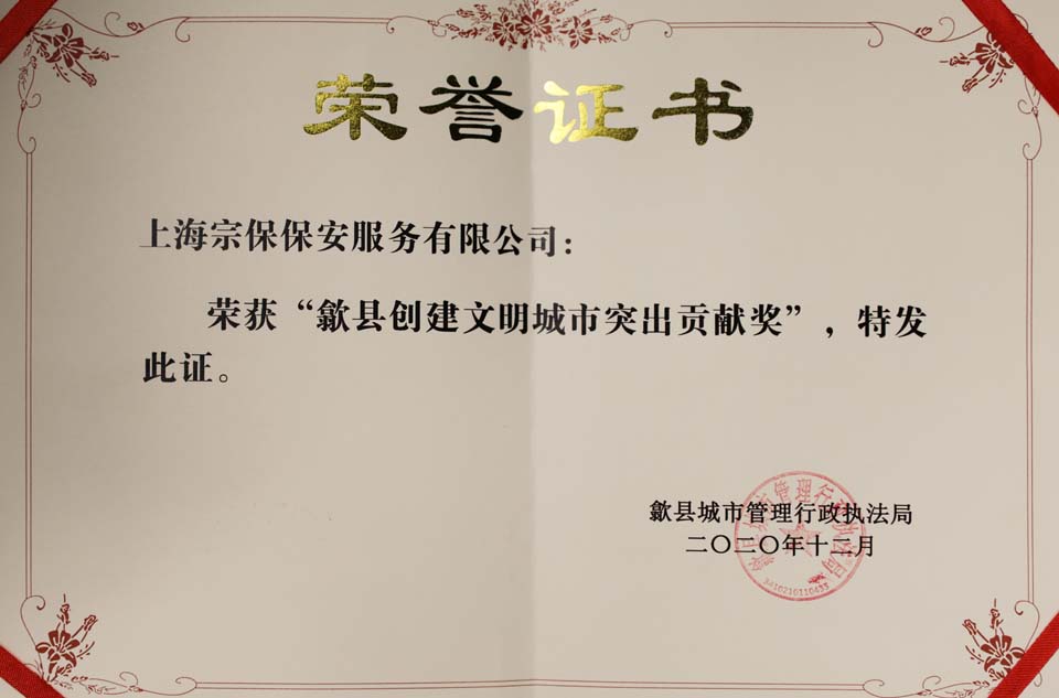 12月25日,歙縣城市管理行政執(zhí)法局局長(zhǎng)凌暉一行來(lái)到公司,為獲評(píng)“創(chuàng)建全國(guó)文明城市先進(jìn)集體”、“歙縣創(chuàng)建文明城市突出貢獻(xiàn)獎(jiǎng)”的上海宗保保安服務(wù)有限公司送來(lái)獎(jiǎng)牌和榮譽(yù)證書(shū)。