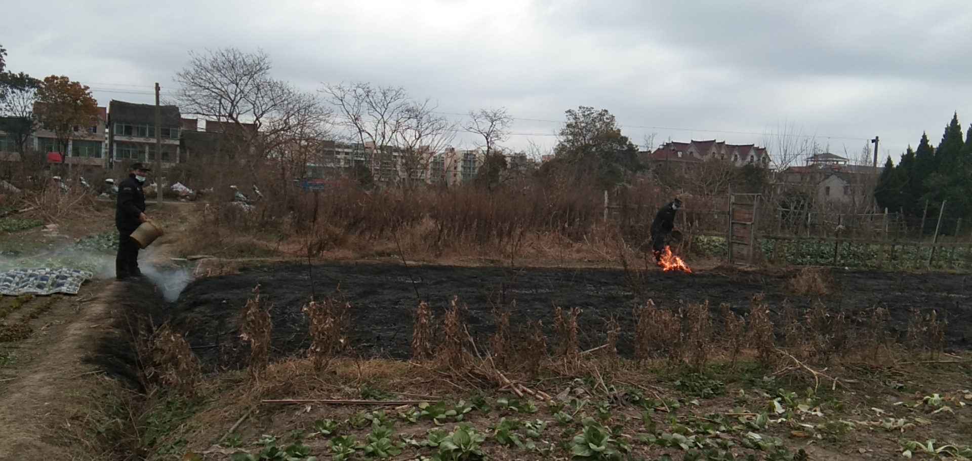 當(dāng)天12:00左右,孫晉國(guó)、陳孟恩、王雙禧巡邏時(shí),發(fā)現(xiàn)紅光地塊附近有濃煙冒起,便立即趕過(guò)去查看。原來(lái)是因村民焚燒垃圾引燃了附近雜草,導(dǎo)致周邊草地大面積起火。情況緊急,三人立刻到附近單位,找來(lái)水桶提水滅火,經(jīng)過(guò)近一個(gè)小時(shí)的撲救,終于將火撲滅。