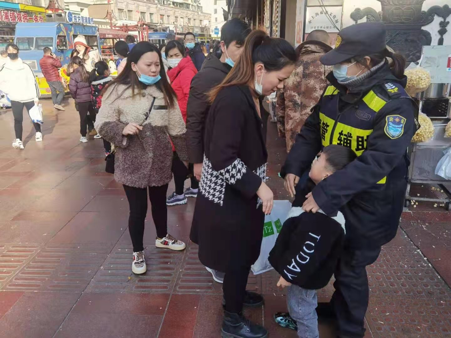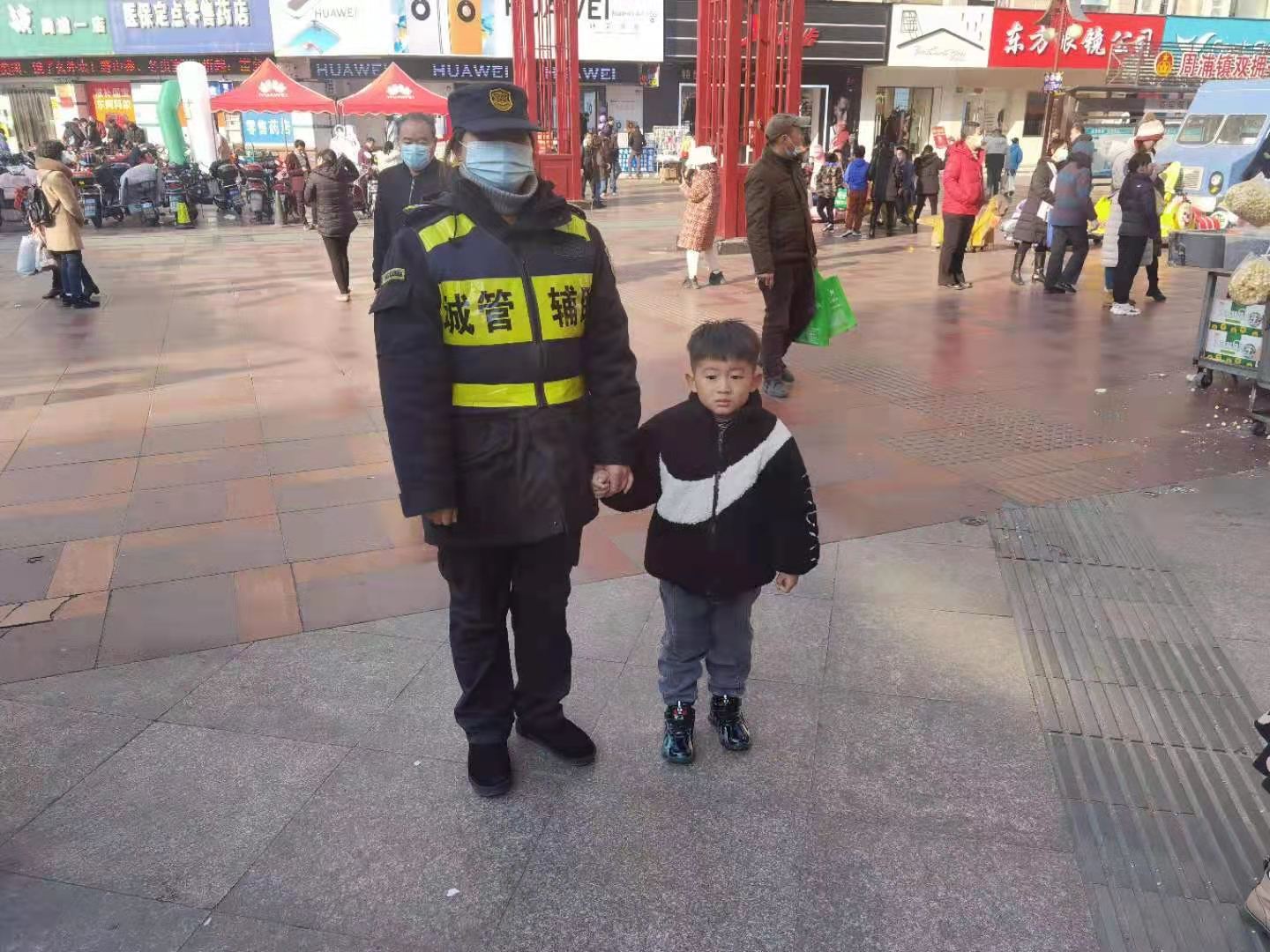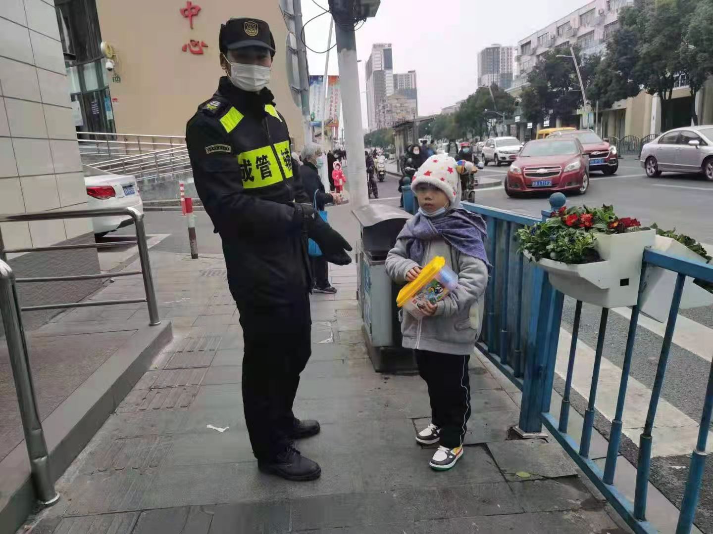 1月5日,宗保公司駐周浦市容機(jī)動(dòng)組隊(duì)員鄒學(xué)峰幫助走散女童找到家人。