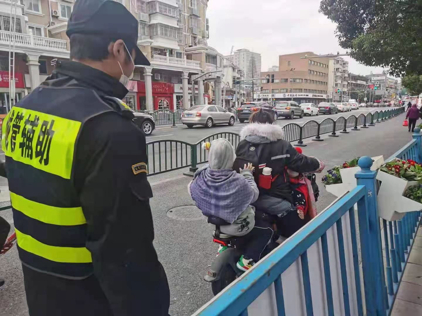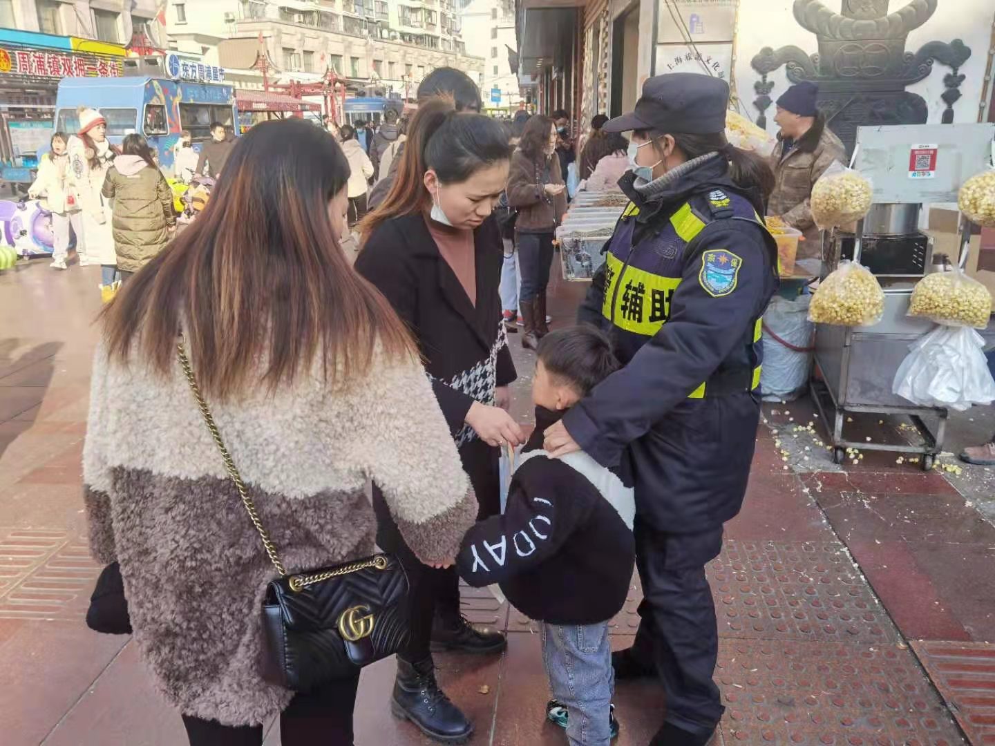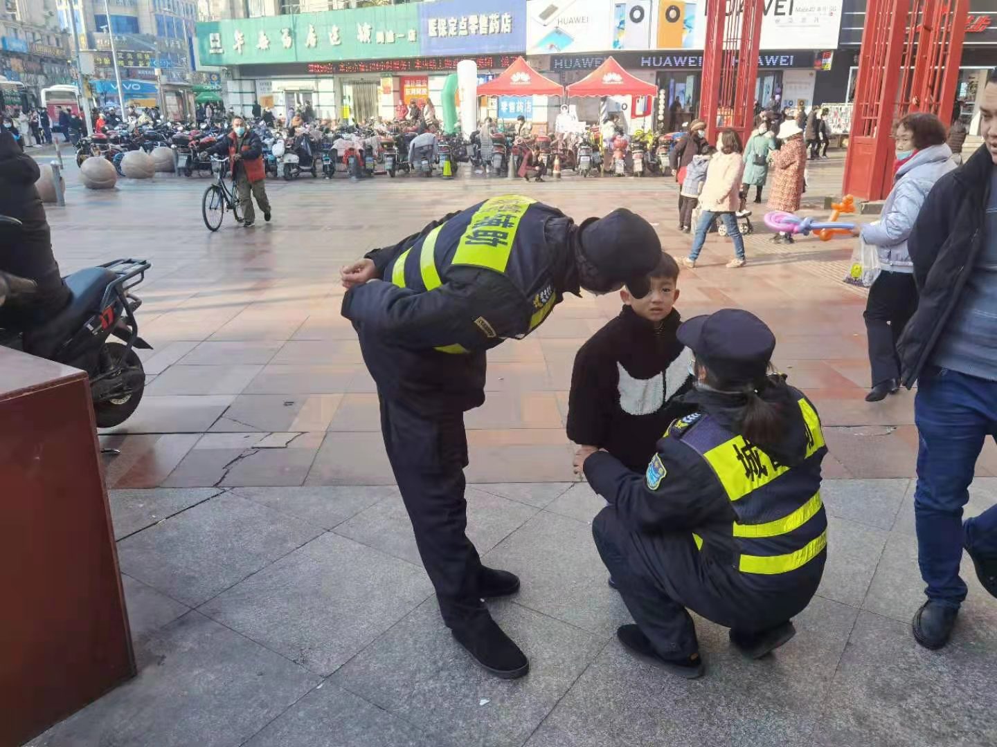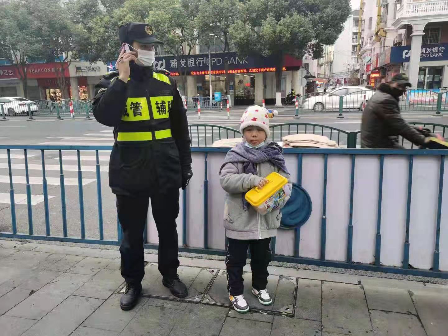 1月5日,宗保公司駐周浦市容機(jī)動(dòng)組隊(duì)員鄒學(xué)峰幫助走散女童找到家人。