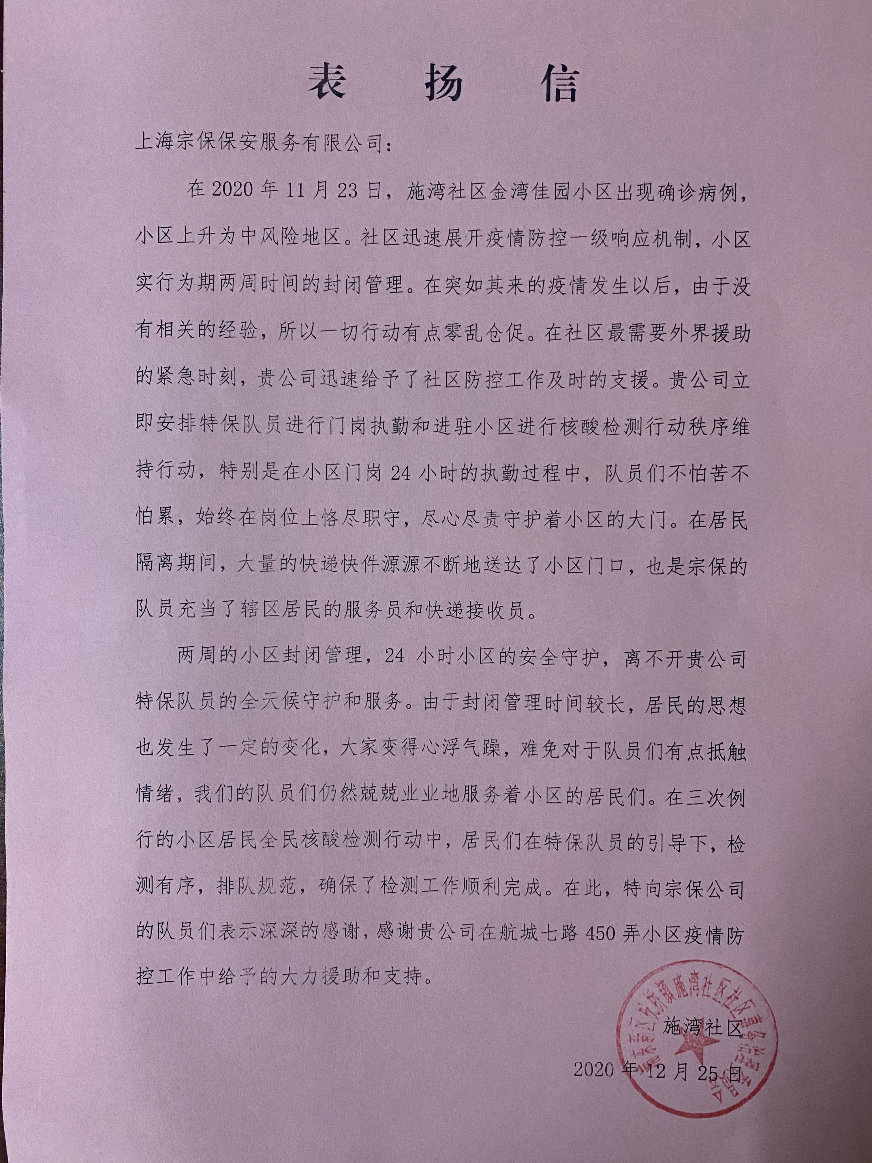 12月25日,宗保公司收到施灣社區(qū)送來的一封表揚信,信中對疫情期間宗保公司的大力援助和用心服務(wù)表示感謝。