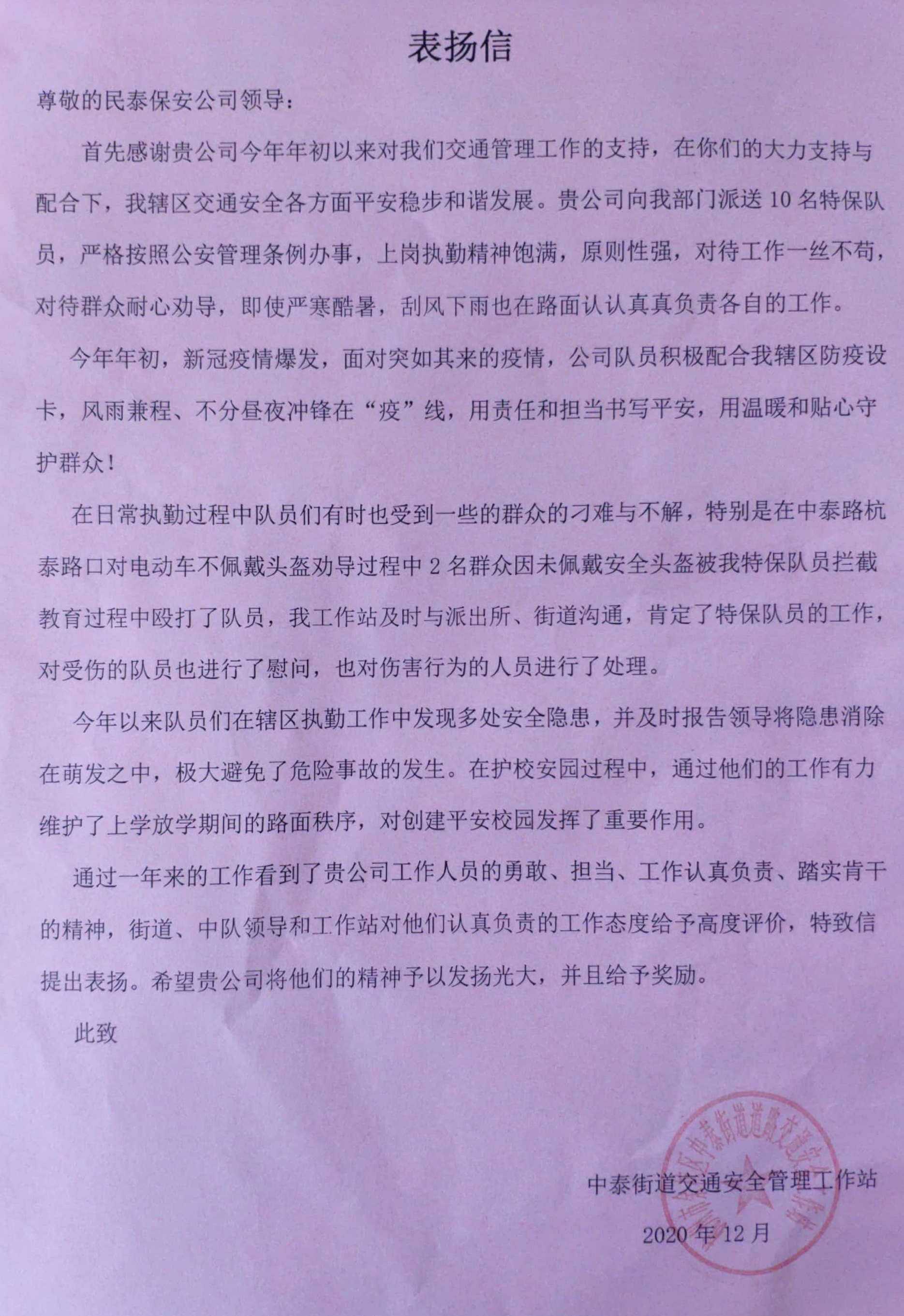 12月28日,中泰街道交通安全管理工作站站長王平將一面繡有“愛崗敬業(yè) 作風(fēng)優(yōu)良”的錦旗和一封表揚信送到民泰公司基地,對民泰隊員盡職盡責(zé)的工作表現(xiàn)提出表揚。