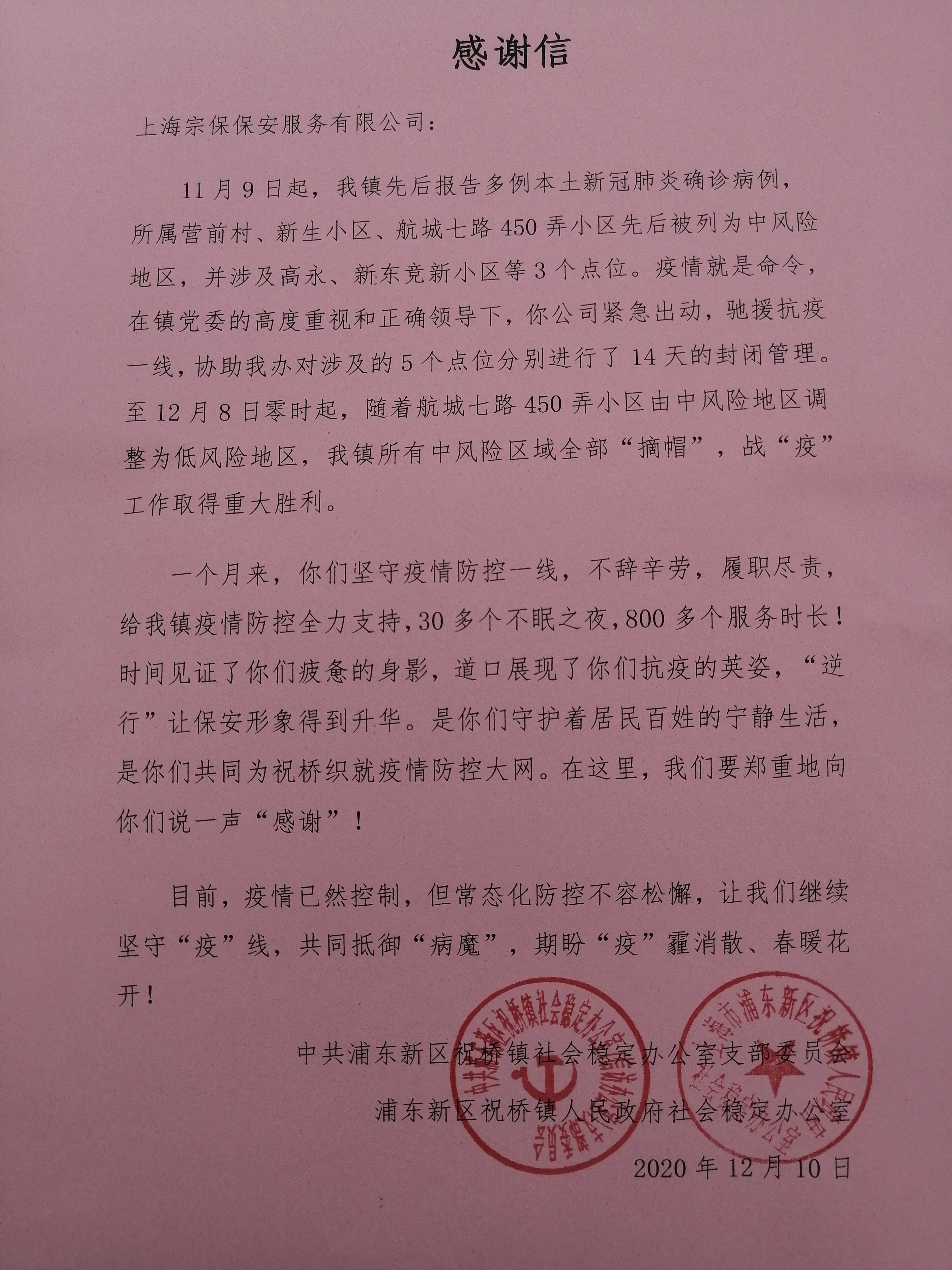 12月10日,宗保公司收到祝橋鎮(zhèn)社會穩(wěn)定辦公室黨支部送來的一封感謝信,信中對公司大力支持祝橋鎮(zhèn)疫情防控工作表示感謝。