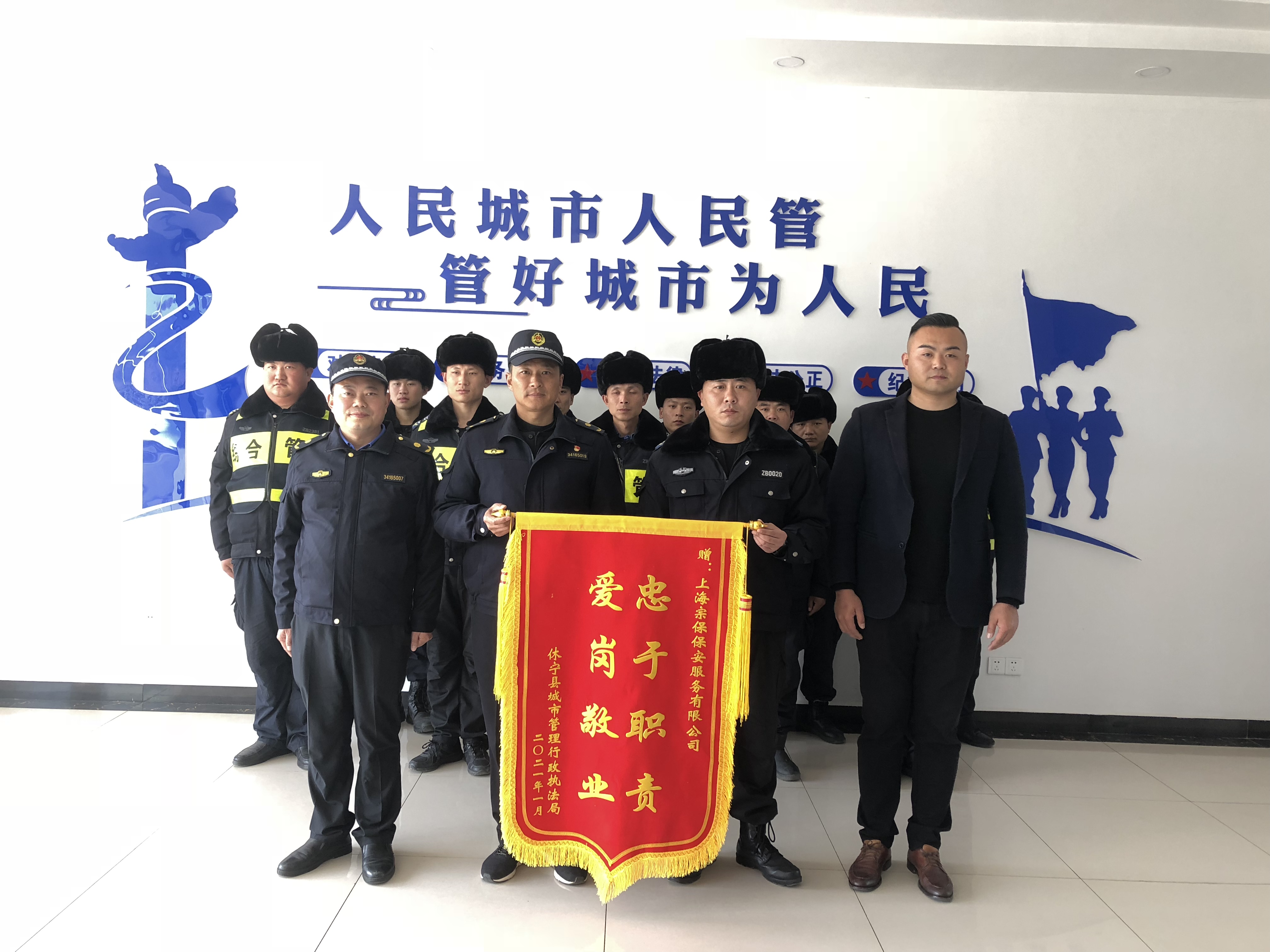 1月18日,休寧縣城市管理行政執(zhí)法局大隊(duì)長(zhǎng)程云彪將一面繡有“愛(ài)崗敬業(yè) 忠于職責(zé)”的錦旗和1000個(gè)醫(yī)用口罩送到宗保公司駐休寧縣項(xiàng)目基地,對(duì)宗保隊(duì)員艱難時(shí)刻擔(dān)當(dāng)作為的表現(xiàn)表示誠(chéng)摯的感謝。
