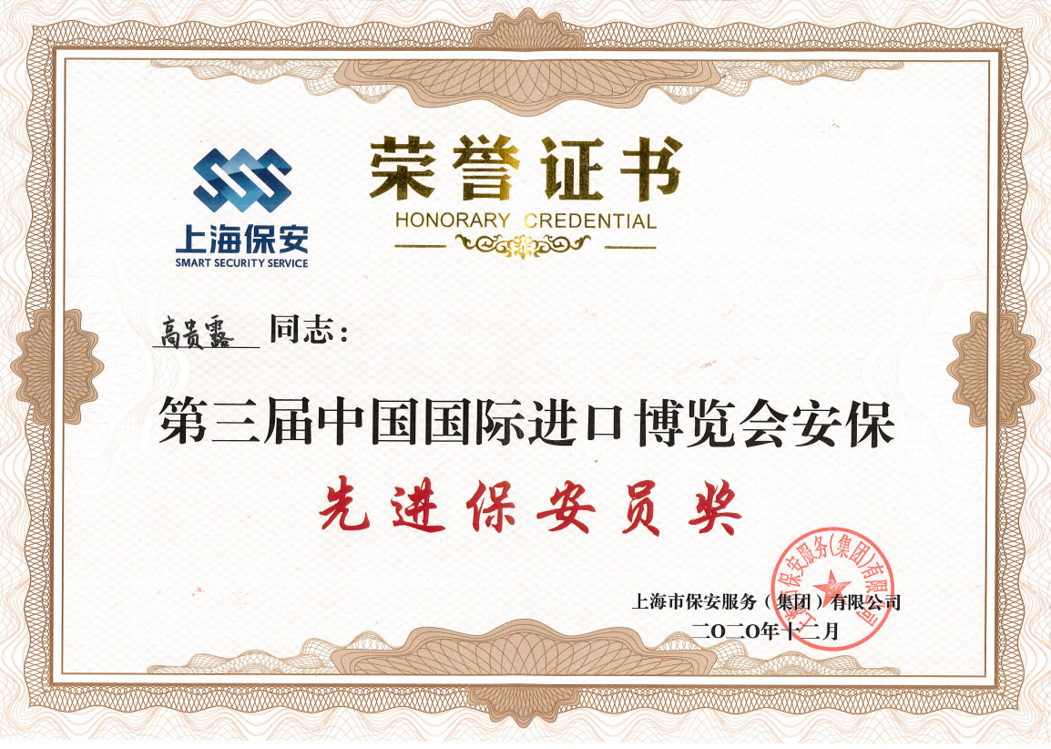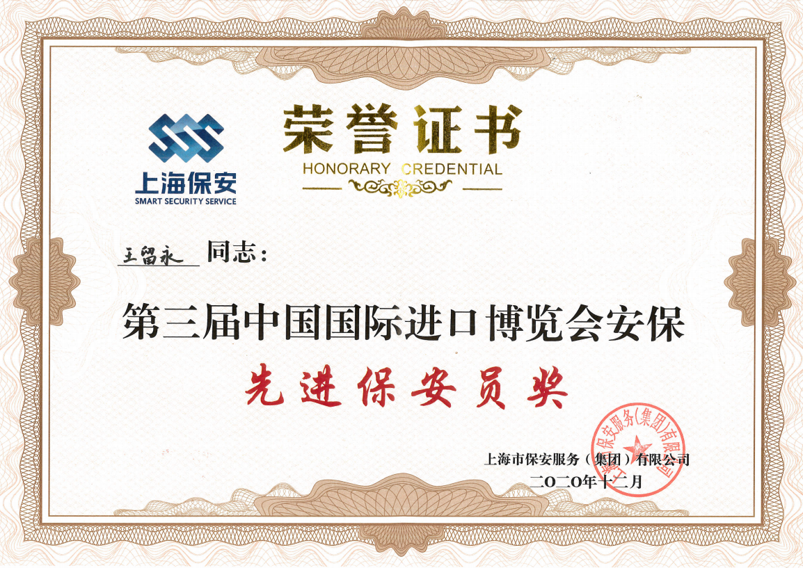 宗保公司以忠誠履職的責(zé)任擔(dān)當(dāng)、規(guī)范細(xì)致的工作標(biāo)準(zhǔn)、飽滿昂揚的精神狀態(tài),圓滿完成了第三屆中國國際進(jìn)口博覽會安保服務(wù)保障工作任務(wù)。其中,公司王留永、高貴露兩名隊員因工作表現(xiàn)突出,榮獲第三屆中國國際進(jìn)口博覽會“安保先進(jìn)保安員獎”。同時,王留永還被授予第三屆中國國際進(jìn)口博覽會安保工作“黨員先鋒”榮譽稱號。