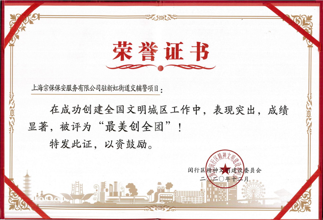 1月7日,閔行區(qū)召開鞏固提升全國文明城區(qū)建設(shè)工作大會,宗保公司駐新虹街道交管輔警項(xiàng)目表現(xiàn)突出,被評為“最美創(chuàng)全團(tuán)”。