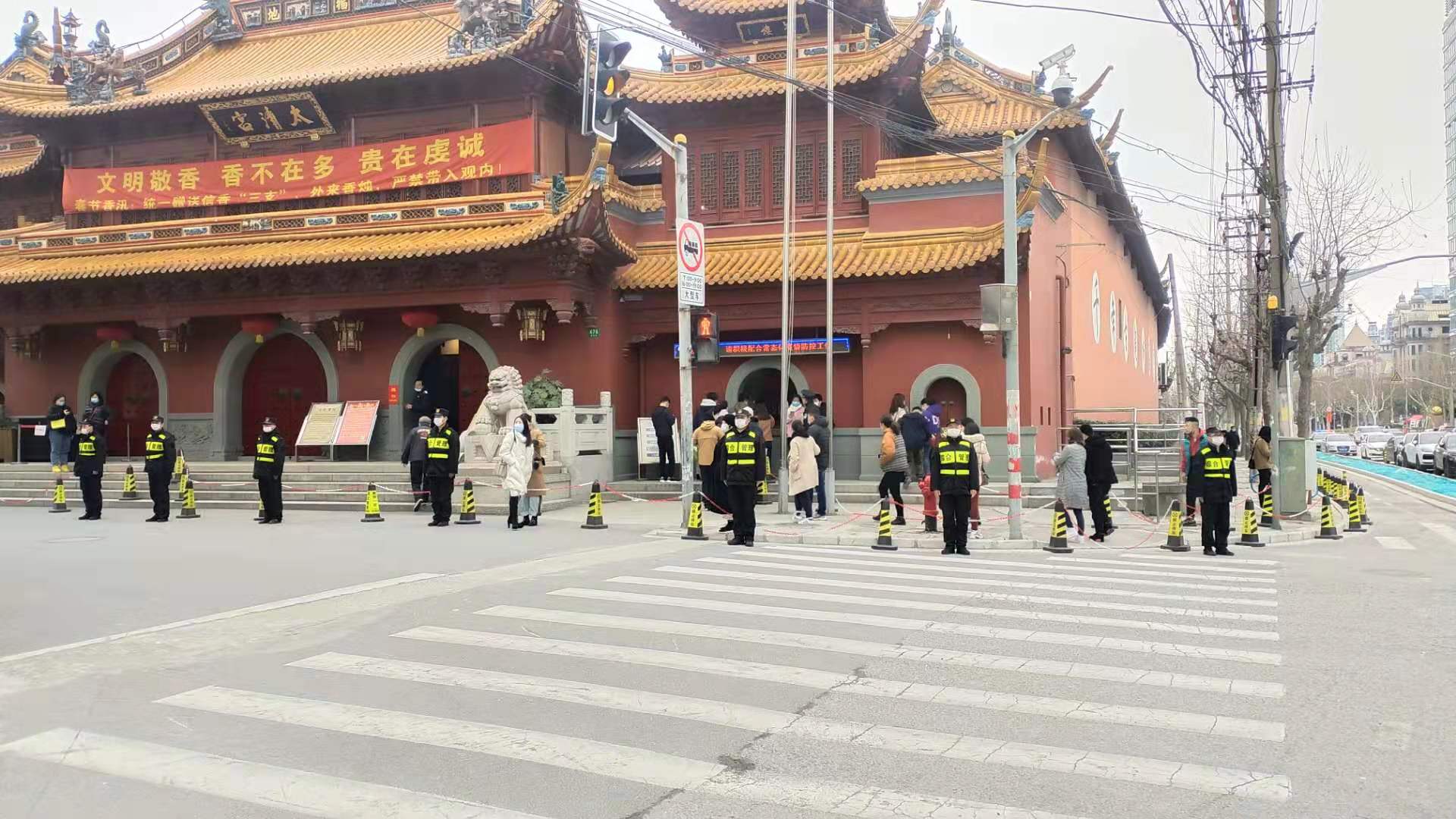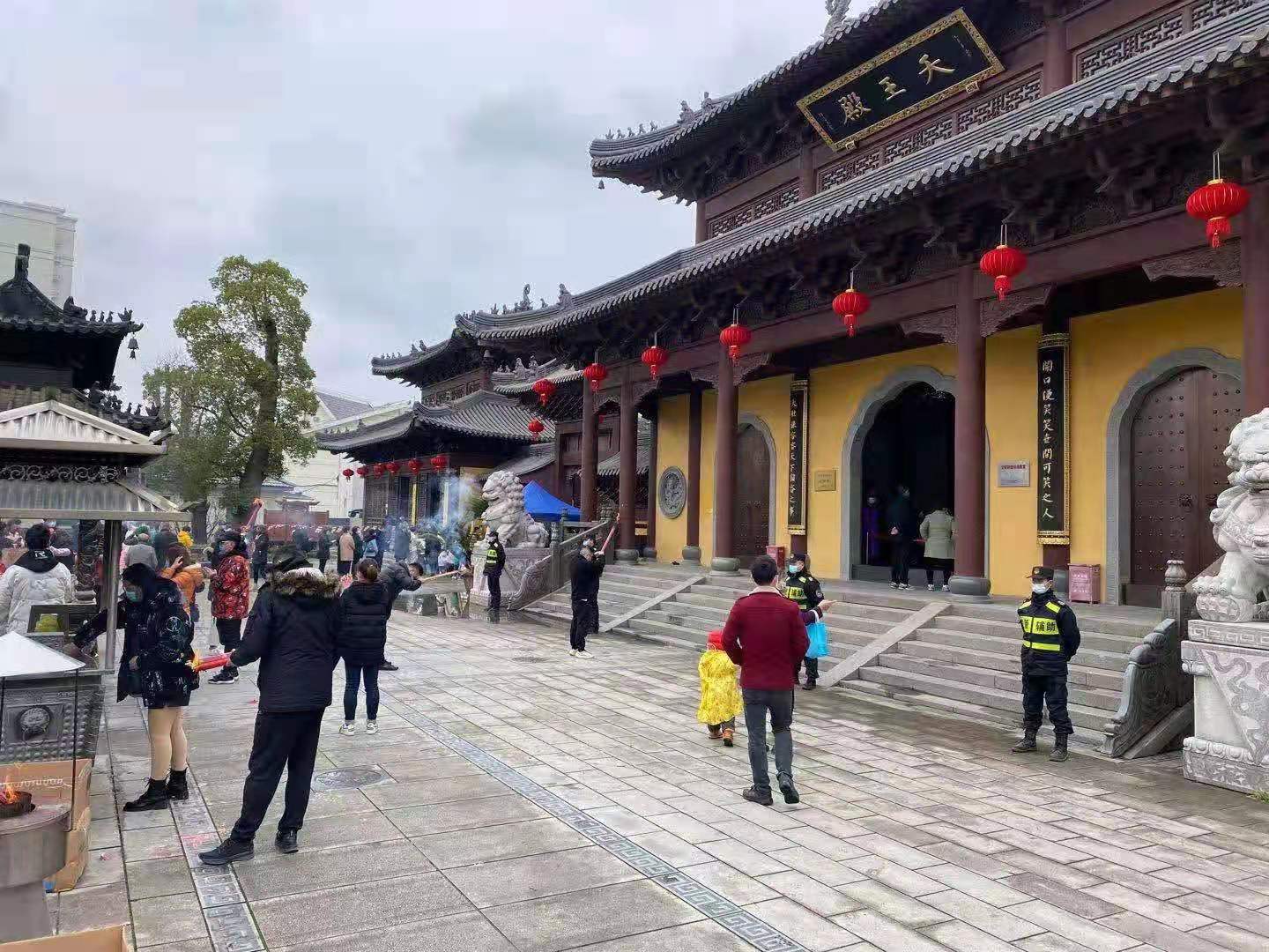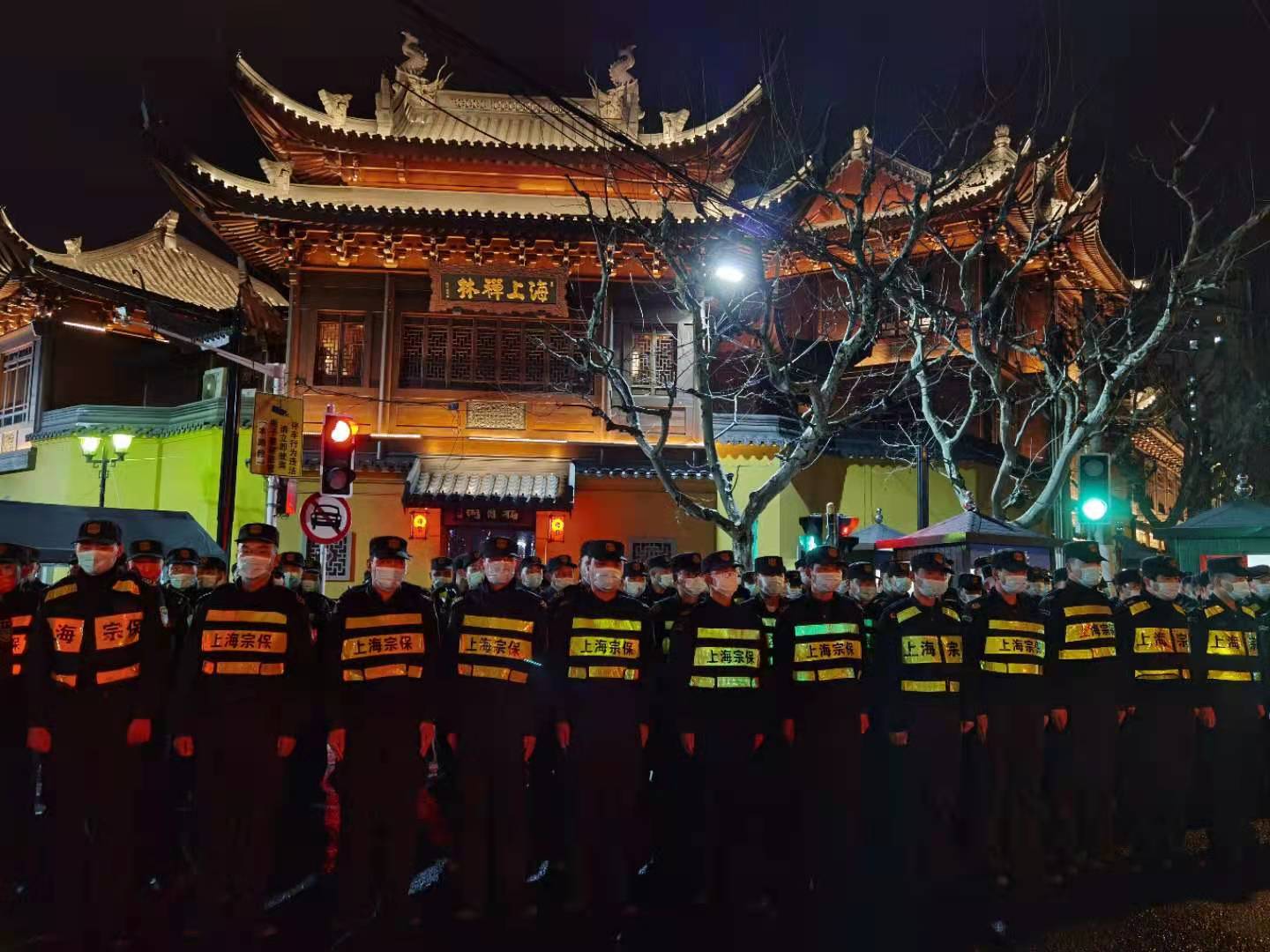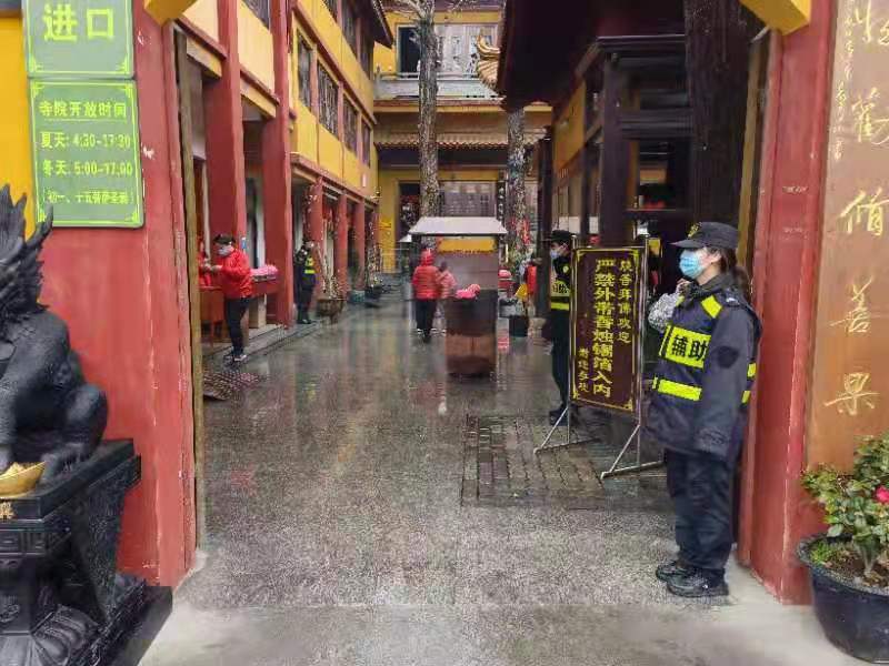 春節(jié)期間,眾多市民群眾到名寺古剎燒香祈福。為確保寺廟祈福活動場所安全有序,除夕當(dāng)天,宗保公司在公安民警和甲方領(lǐng)導(dǎo)的指導(dǎo)下,派出精干隊員全力參與上海、杭州兩地18座寺廟的秩序維護(hù)保障工作。