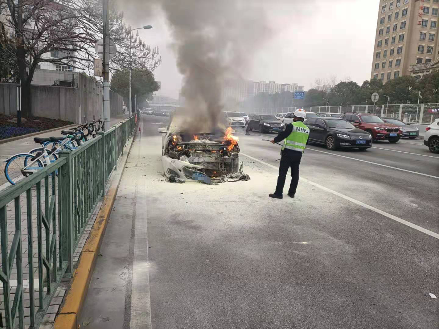 3月15日,宗保公司駐虹橋交管輔警項目組長康建鋒協(xié)助消防撲滅起火車輛。