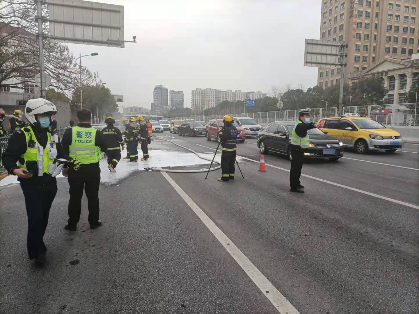 隨即趕到現場的隊員,配合消防和民警,對現場進行緊急疏散,引導過往車輛分流繞行,經過近半個小時的奮戰(zhàn)終于將火撲滅。