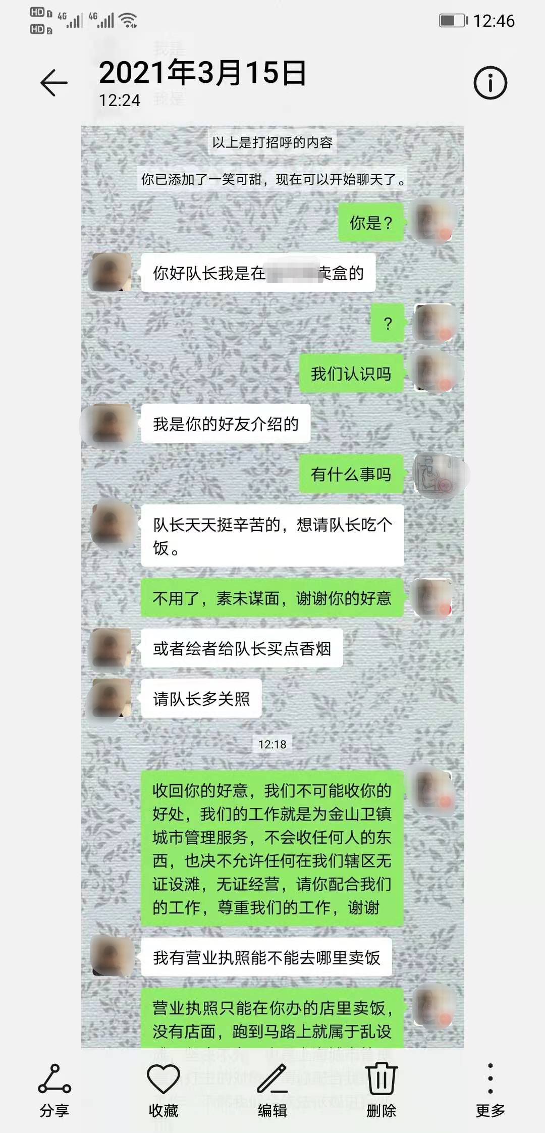 當(dāng)天下午,那位仍不死心的商販打聽并添加了項(xiàng)目隊(duì)長(zhǎng)茍青安的微信,表示:“想請(qǐng)隊(duì)長(zhǎng)吃飯買兩條香煙,讓保安隊(duì)給予方便照顧一下。”茍青安當(dāng)即向他講明了公司的工作紀(jì)律,告知其要遵守市容管理規(guī)定,無(wú)證無(wú)照亂設(shè)攤是堅(jiān)決不允許的,隨即將對(duì)方的微信拉黑。