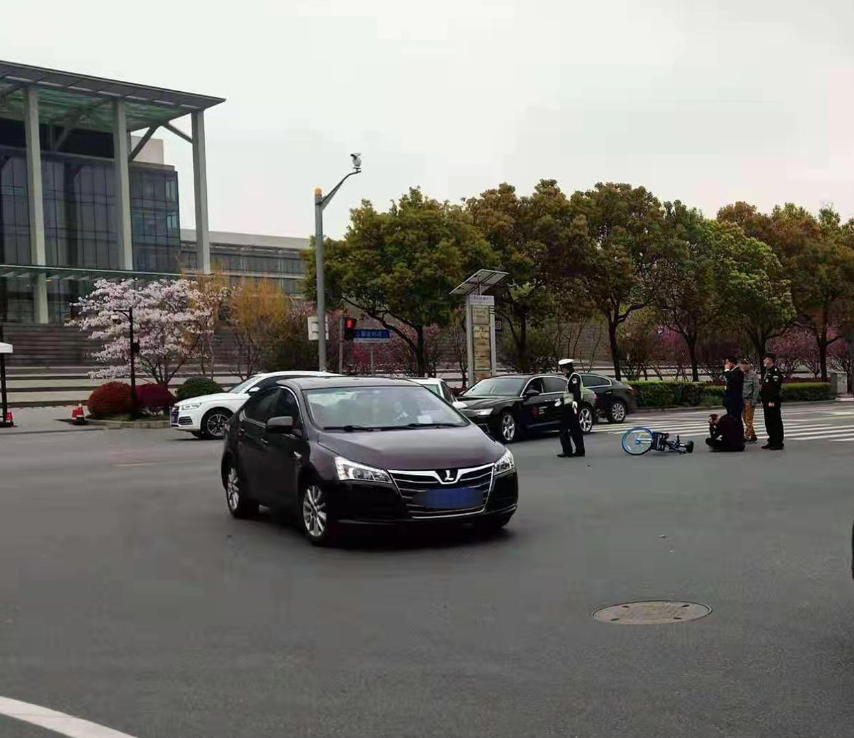 當(dāng)日12:40左右,陳海南巡邏至板泉路東方吉苑小區(qū)斑馬線處時(shí),遇到一起交通事故,一輛白色轎車和一輛電動(dòng)車相撞了。