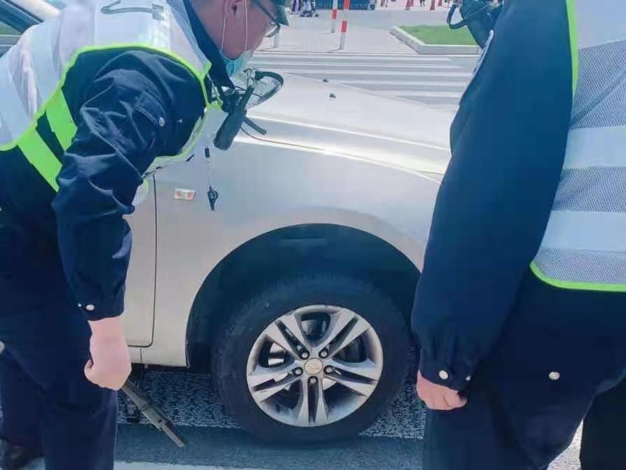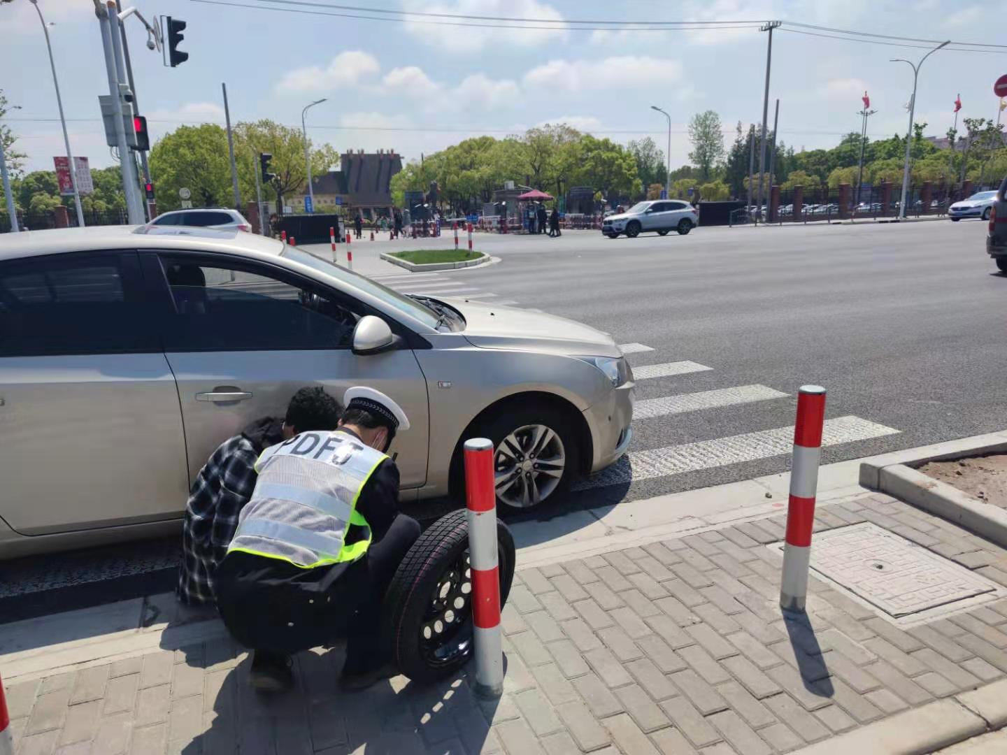 當(dāng)日10:15,一位女士駕駛汽車行駛至動(dòng)物園2號(hào)門(mén)時(shí),車輛右前輪突然爆胎,打著雙閃燈停在斑馬線上,路口當(dāng)值交管輔警王志文和候歡發(fā)現(xiàn)后,立即上前詢問(wèn)。