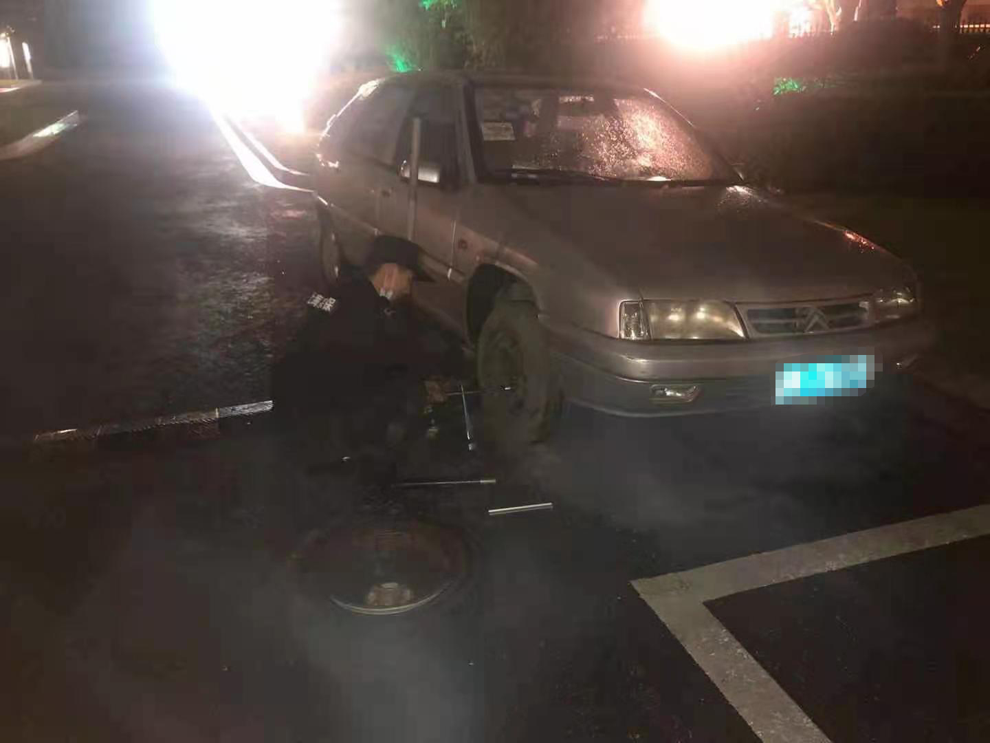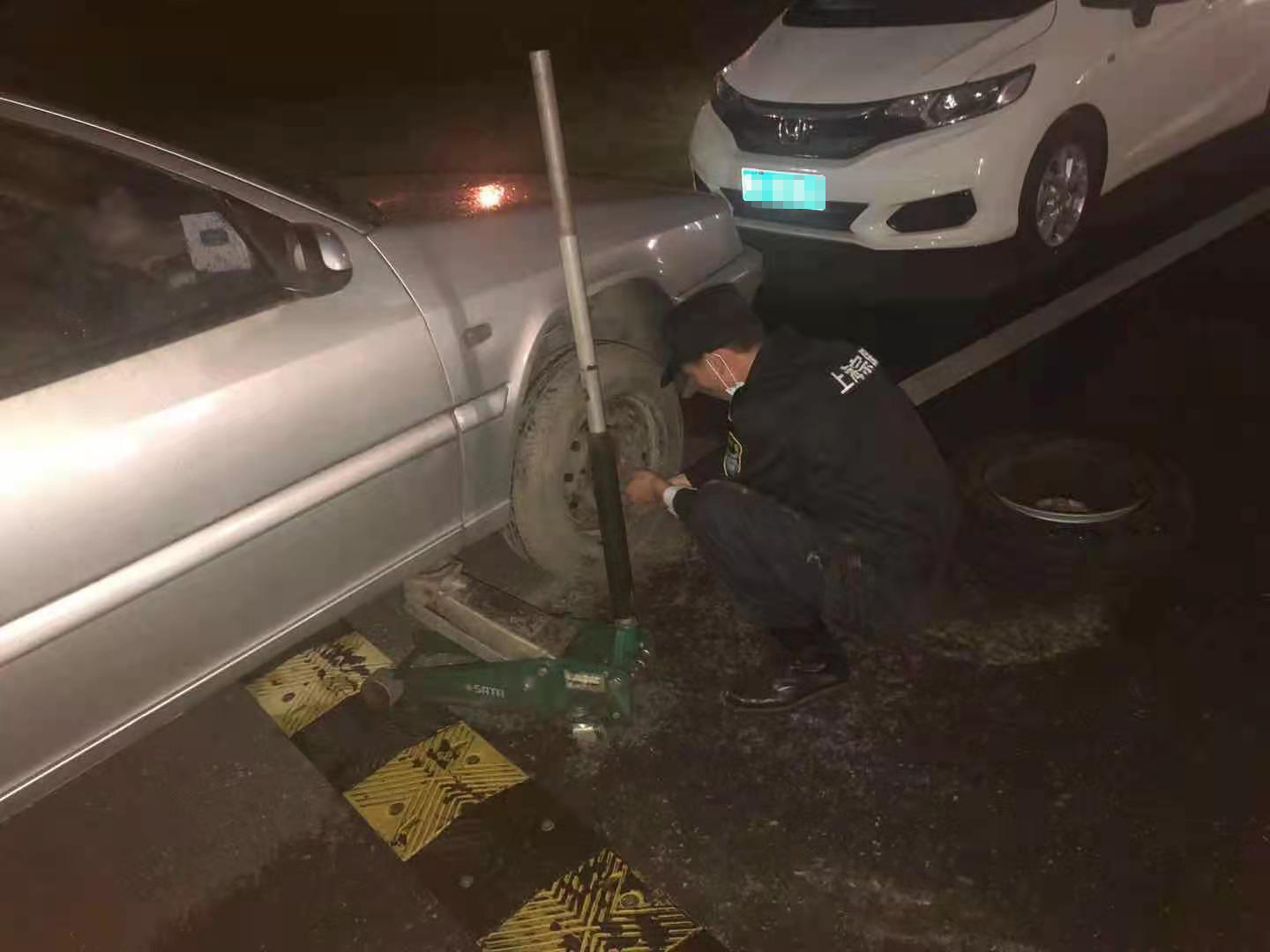 車輛爆胎車主急 隊(duì)員幫忙解難題—市委黨校項(xiàng)目隊(duì)員幫助車輛爆胎老師更換車胎