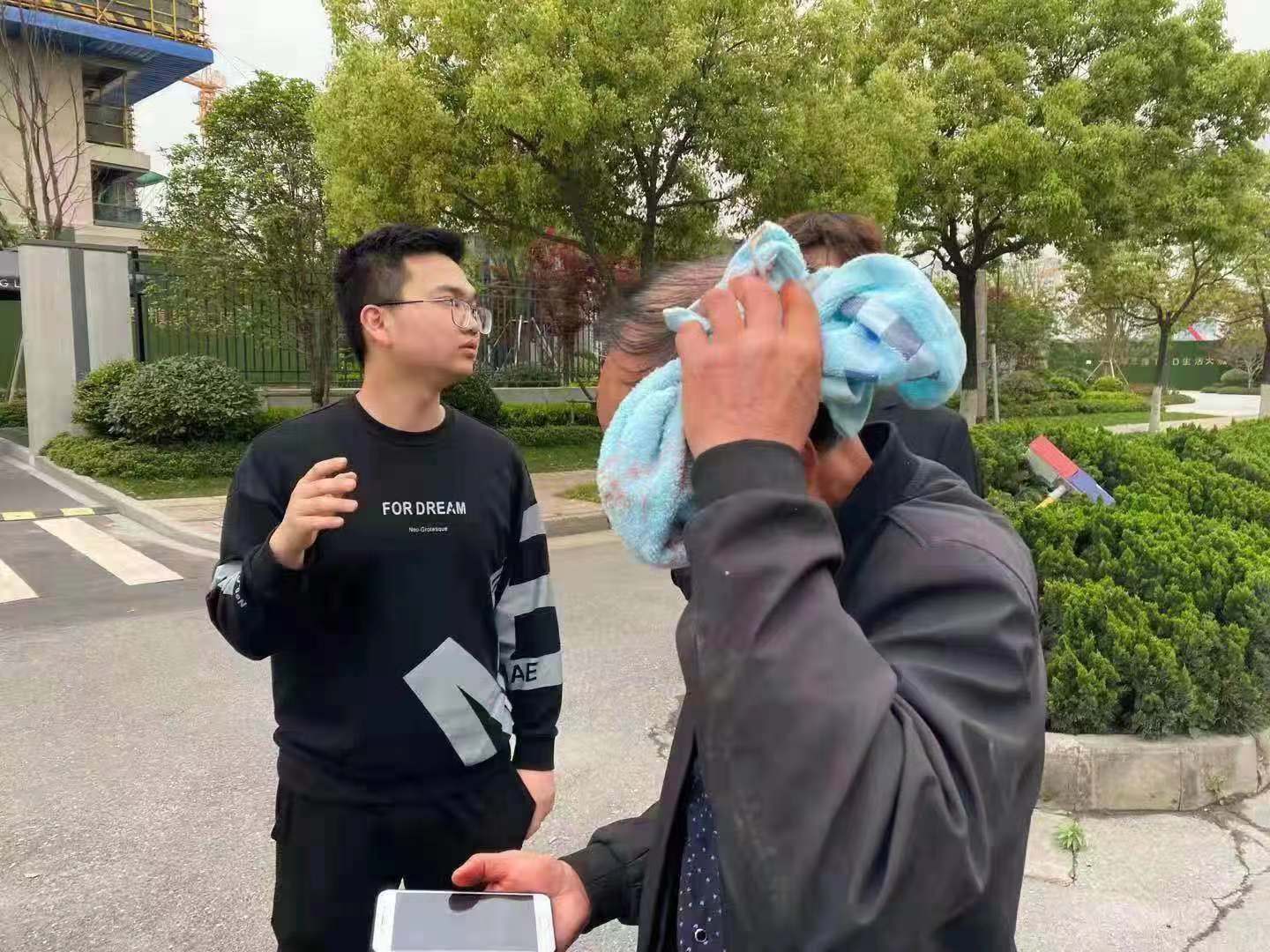 4月27日,浙江民泰公司駐星橋交管項(xiàng)目隊(duì)員勸說(shuō)頭部受傷老人前往醫(yī)院就醫(yī)。