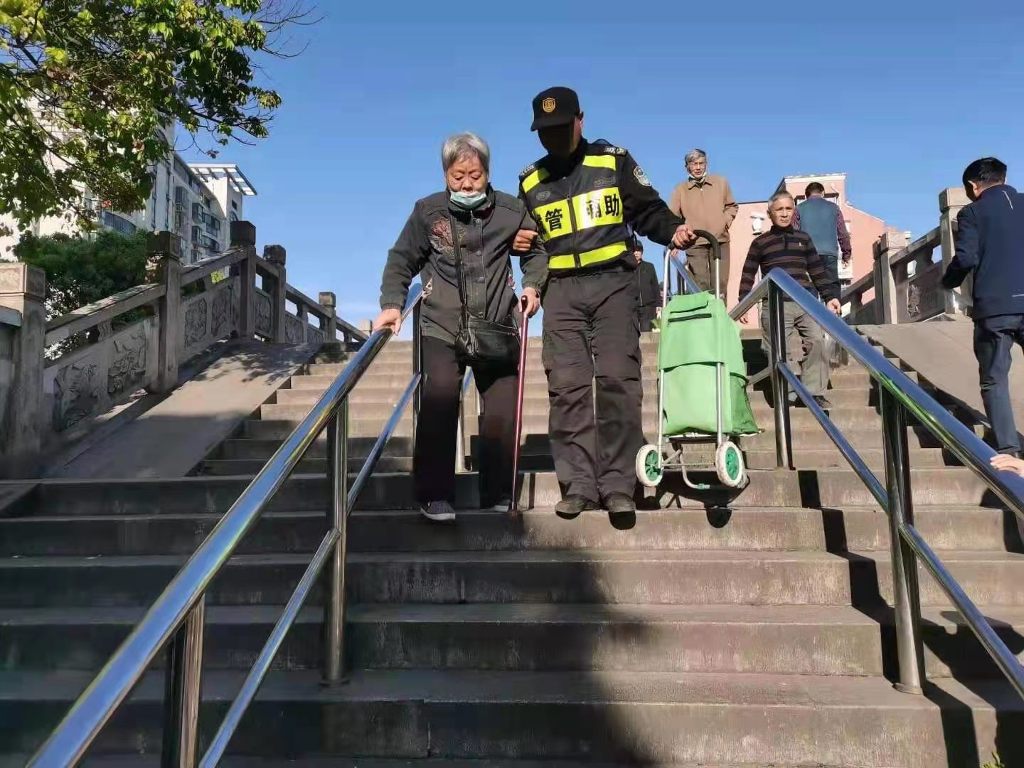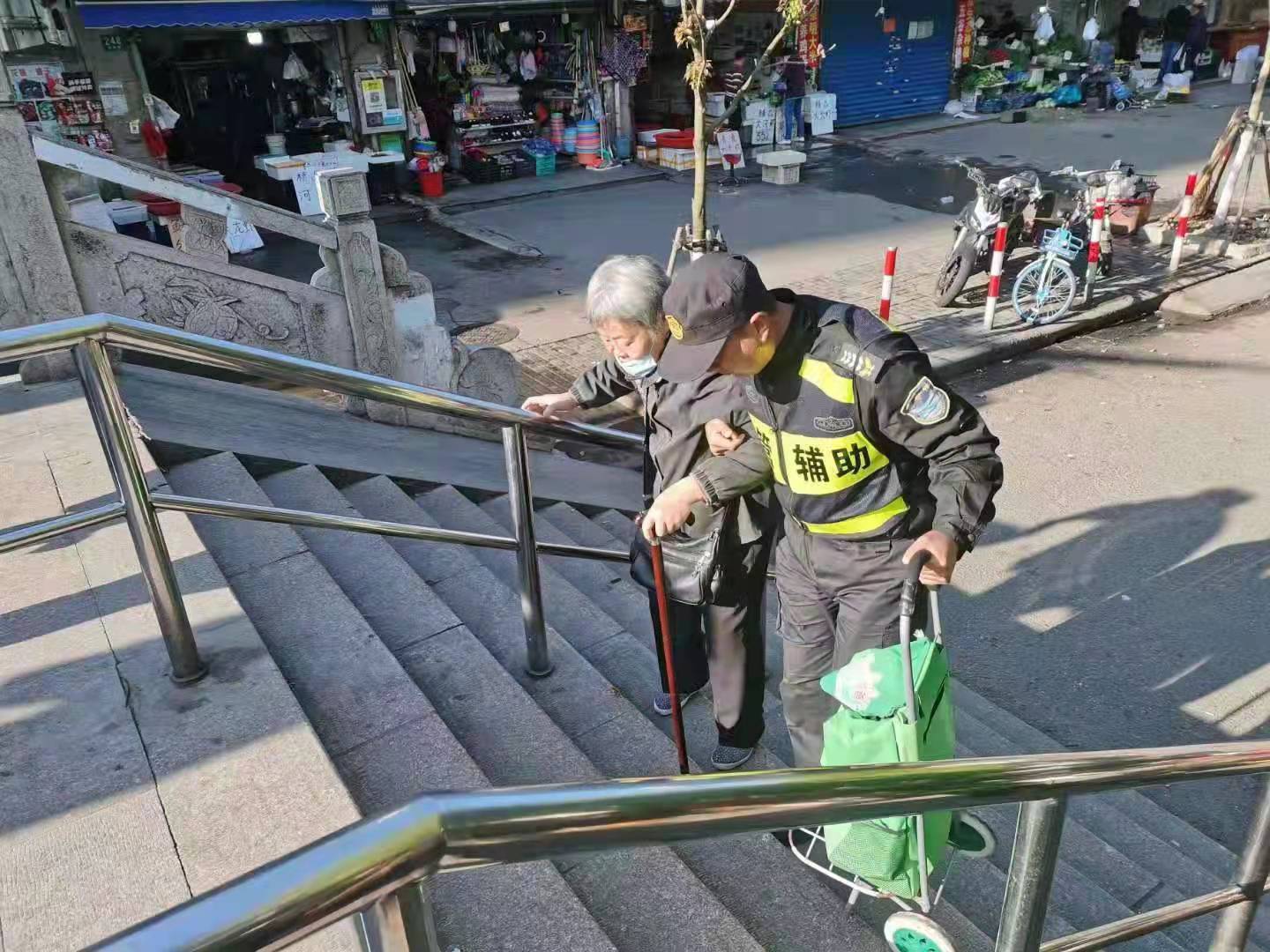 當(dāng)日7:00左右,鄭健在湯家木橋巡邏時(shí),看到一位老奶奶,正推著裝滿物品的購(gòu)物車,行動(dòng)不便,在天橋上艱難地行走著。