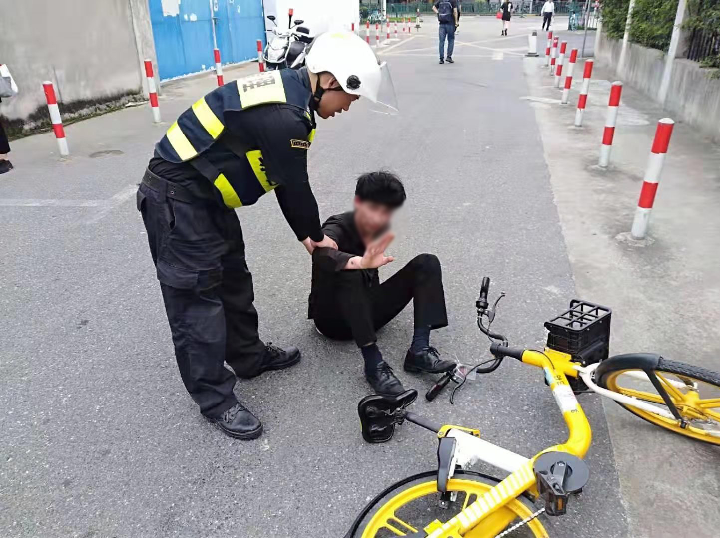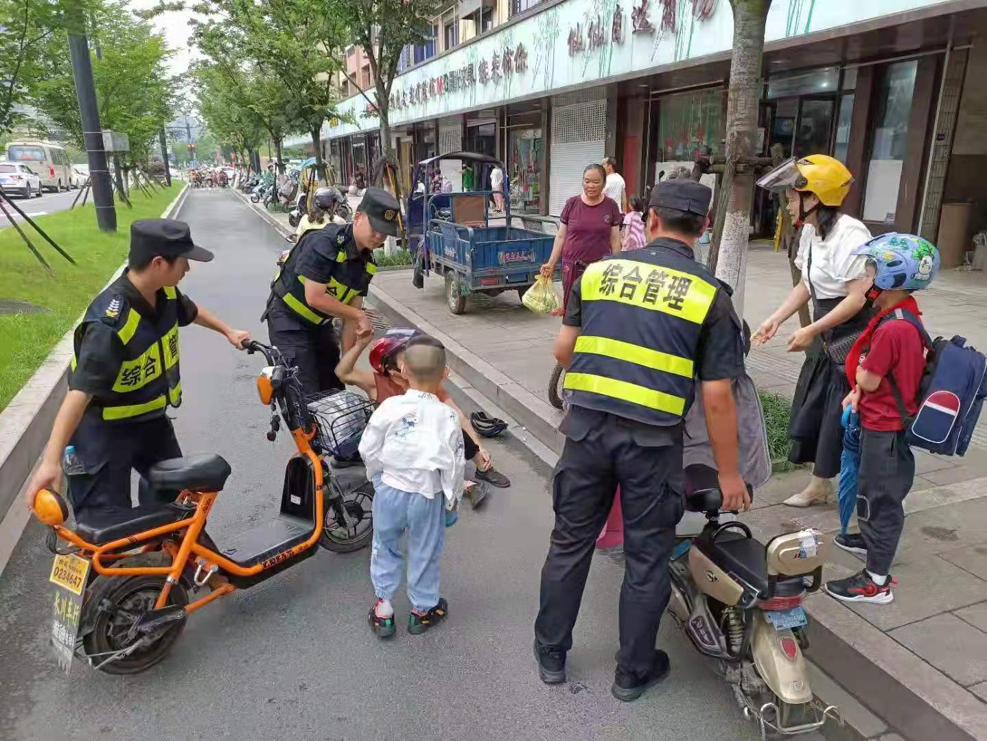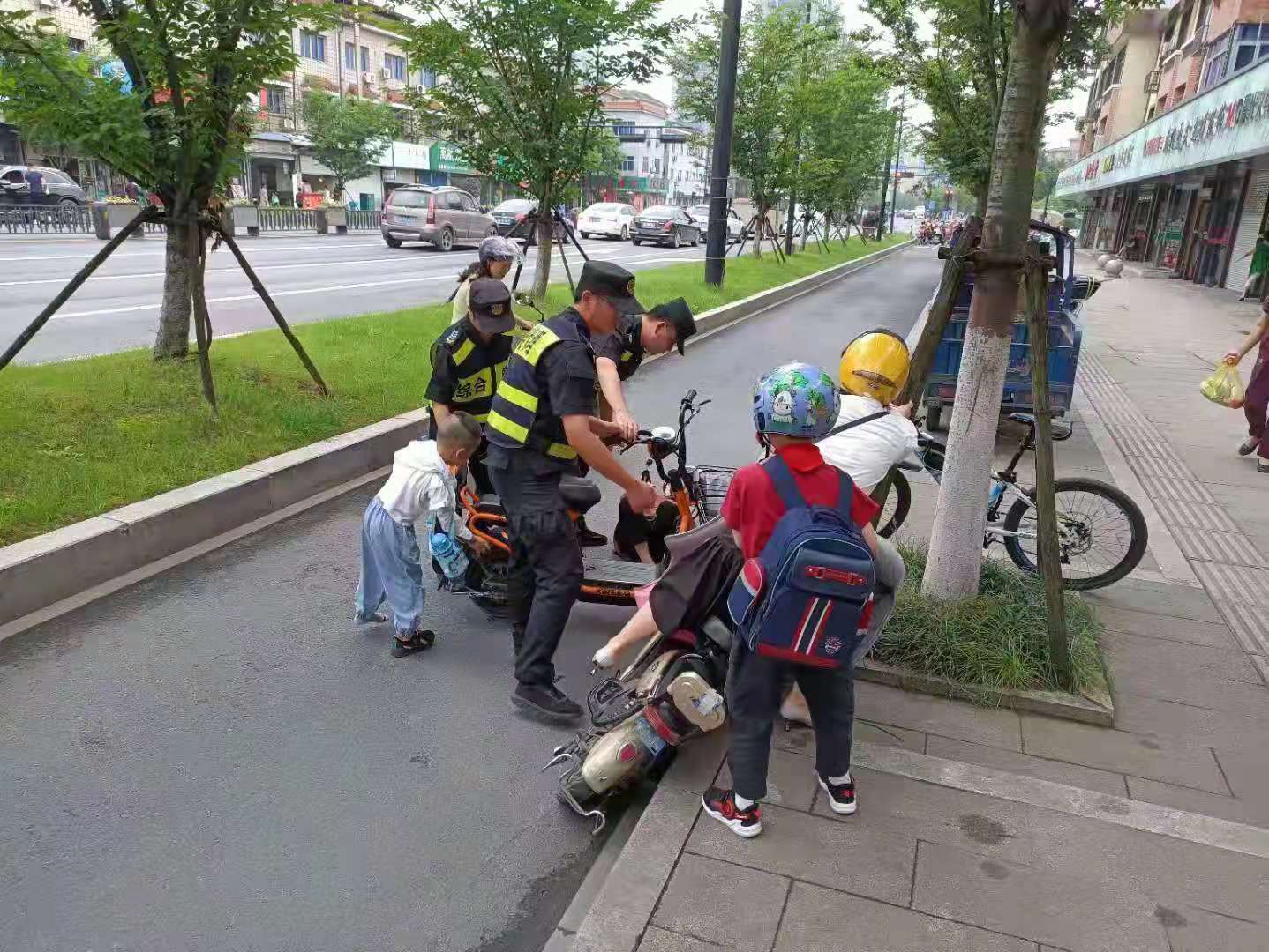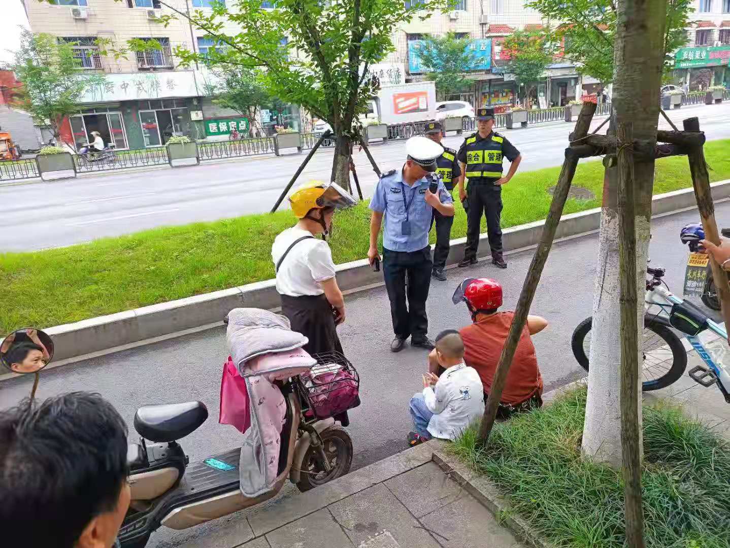 當(dāng)日8:05,正值學(xué)生上學(xué)高峰時(shí)間段,李川、朱鵬旭、強(qiáng)志楊3人沿著中泰路由西向東巡邏時(shí),突然看到前方兩輛電瓶車(chē)追尾相撞,一位老人和電瓶車(chē)摔倒在地上。