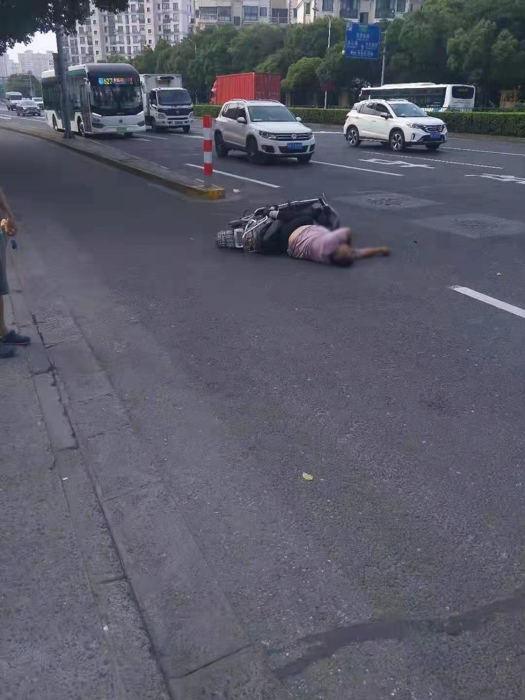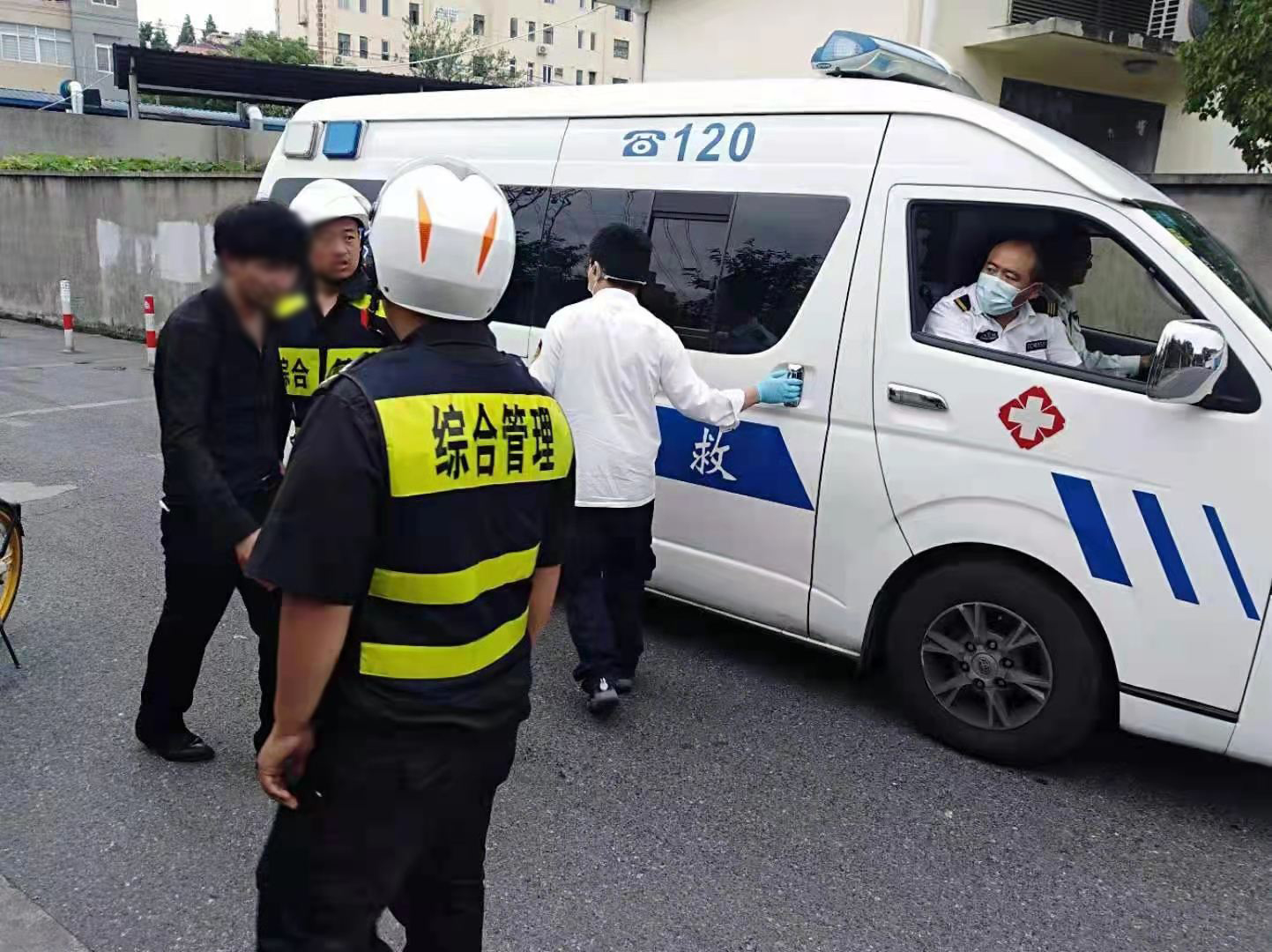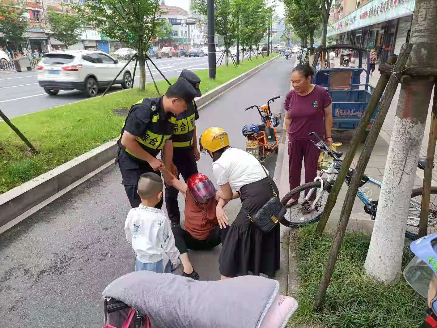 男子騎車(chē)突倒地 隊(duì)員救助暖人心—三林市容項(xiàng)目隊(duì)員救助騎車(chē)摔倒男子