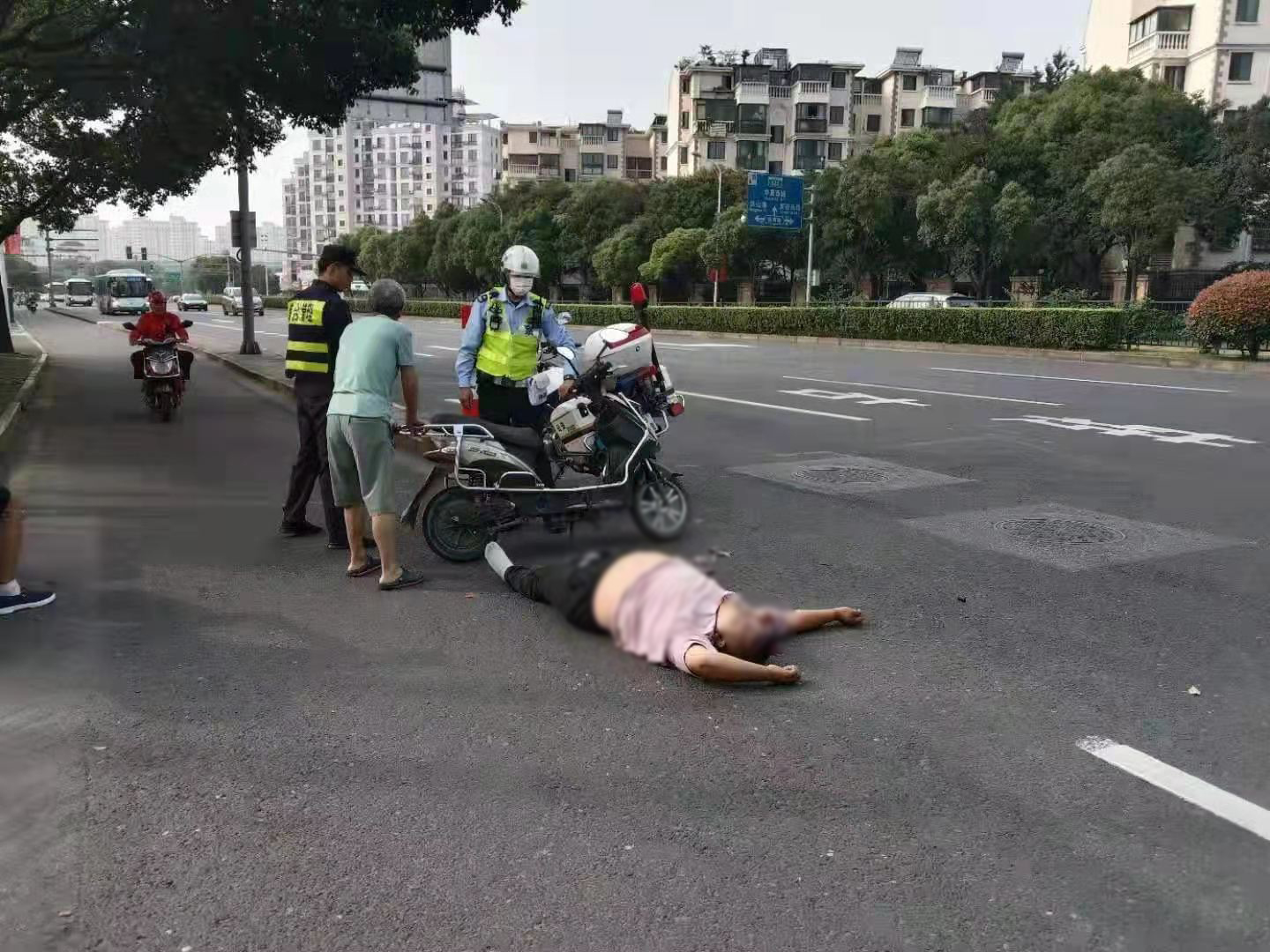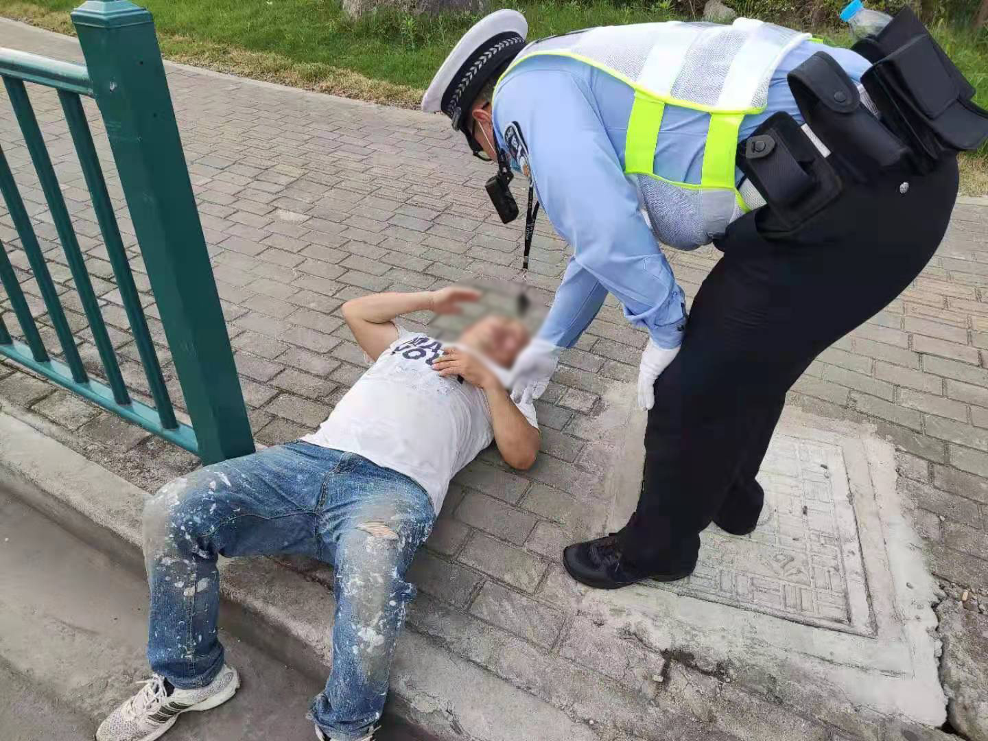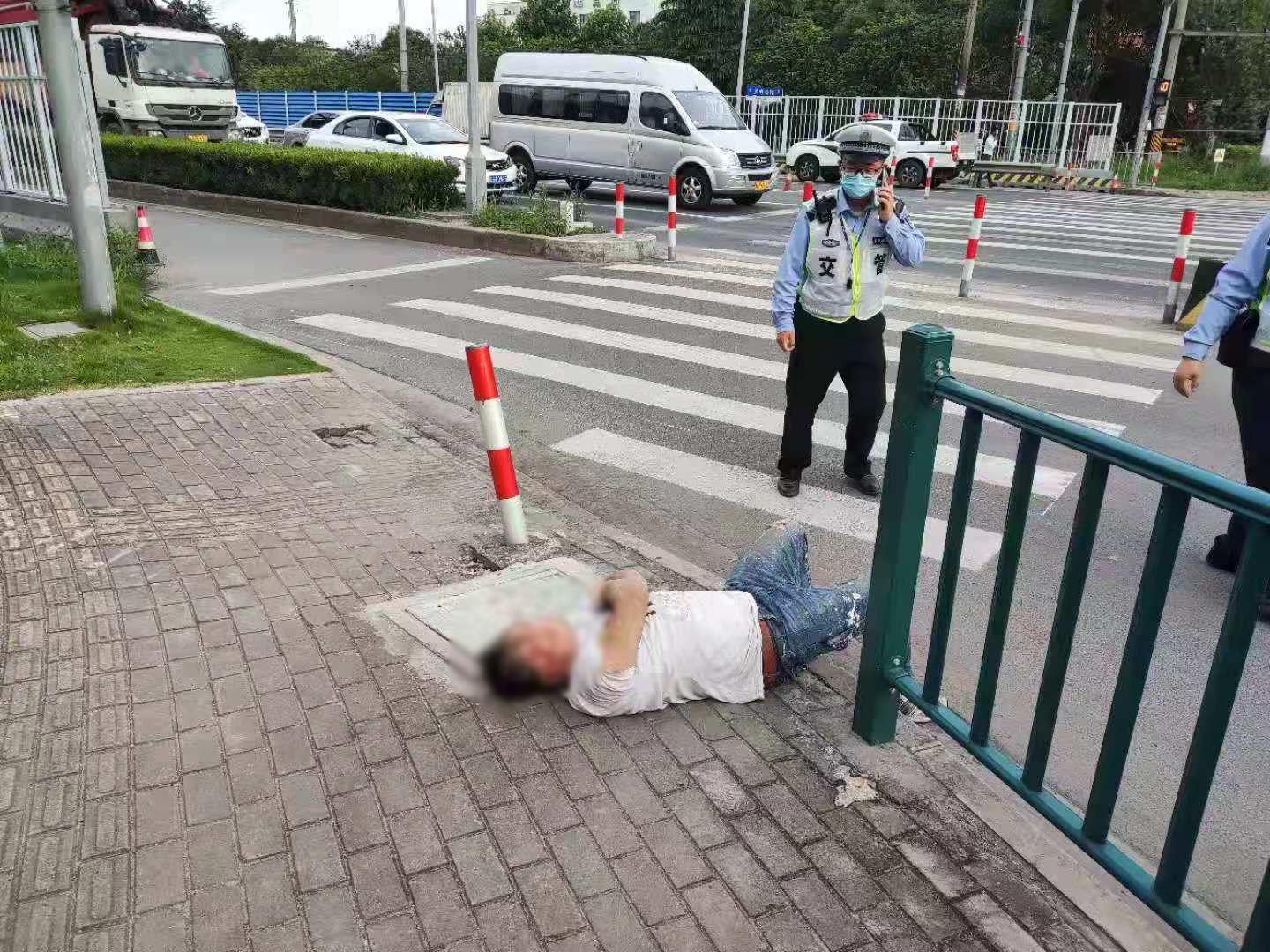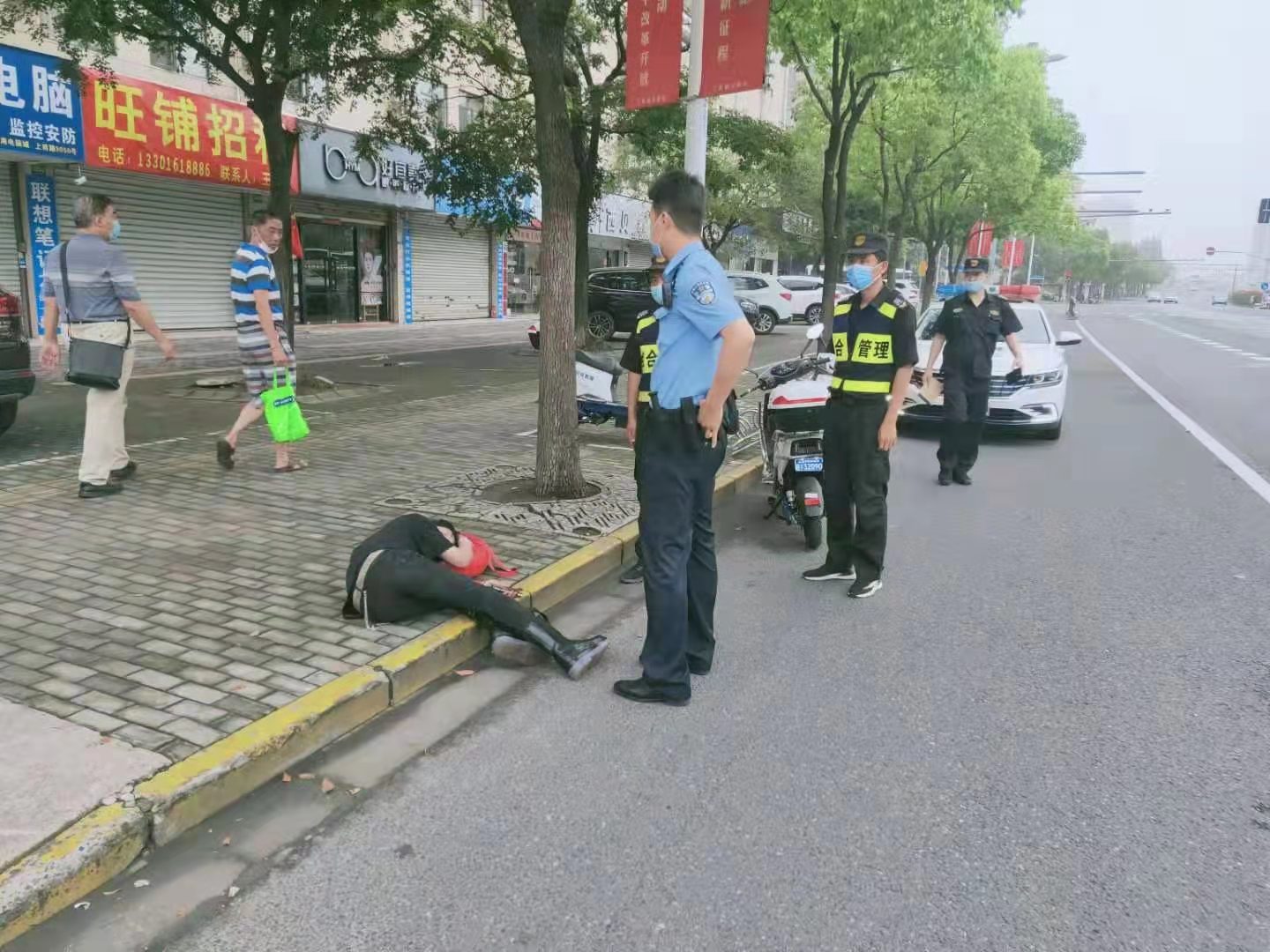 當(dāng)天7:20左右,張展展、張志恒巡邏至上南路西側(cè)國(guó)美電器門(mén)口時(shí),看到路邊人行道上有群眾圍觀,便趕緊上前查看。