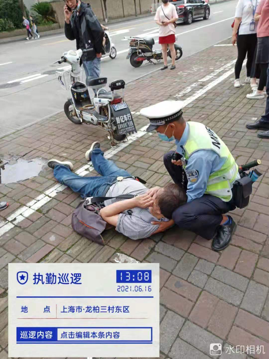 當(dāng)天13:08,胡裕華、茶建海值勤時(shí),看到一位老人倒在馬路邊上,旁邊雖有過(guò)往圍觀群眾,但無(wú)人幫助。