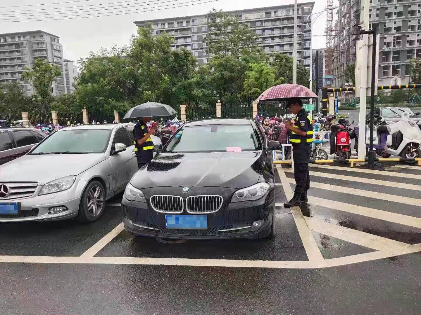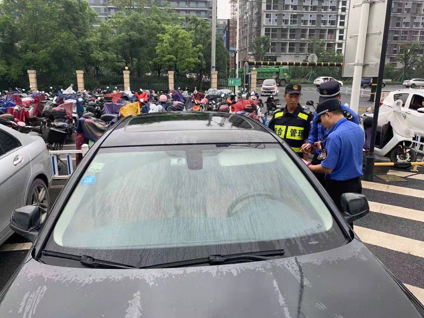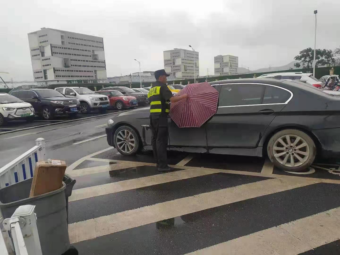 車(chē)主忘關(guān)車(chē)窗   隊(duì)員撐傘擋雨—良渚地鐵菜場(chǎng)項(xiàng)目隊(duì)員為車(chē)撐傘擋雨