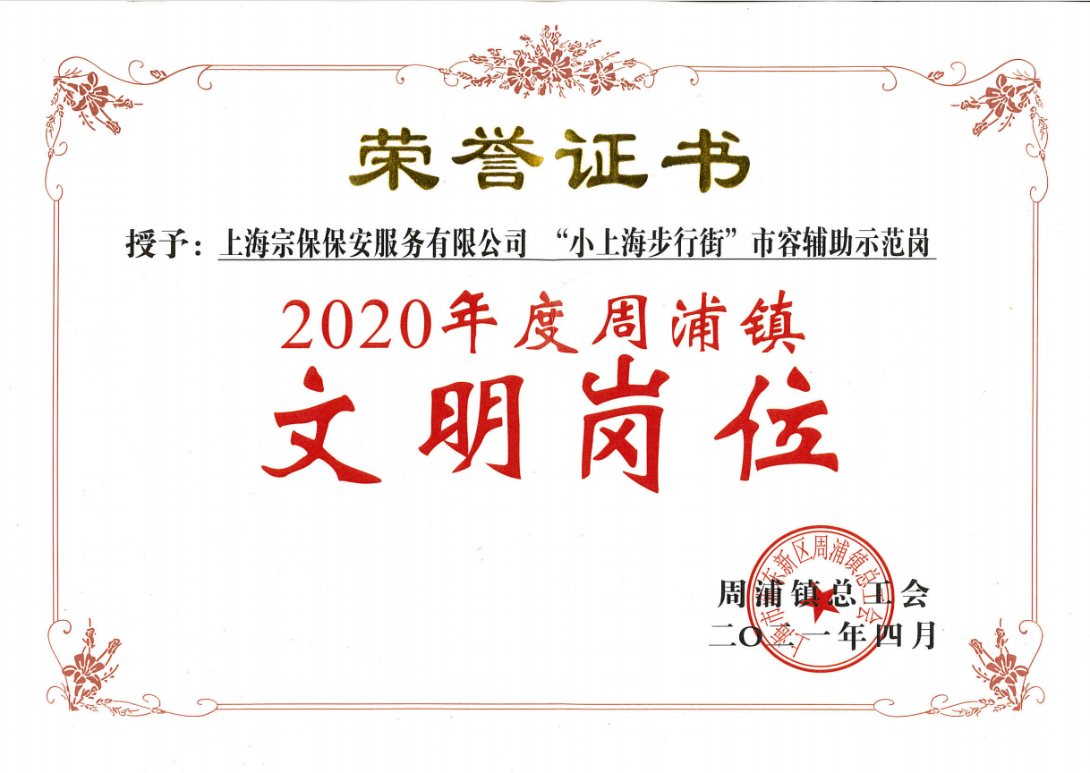為進一步弘揚勞模精神、勞動精神、工匠精神,近日,周浦鎮(zhèn)總工會對一批先進集體和先進個人進行了表彰。宗保公司“小上海步行街”市容輔助示范崗榮獲周浦鎮(zhèn)文明崗位稱號。