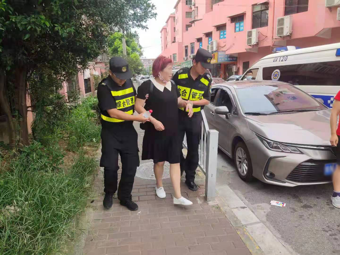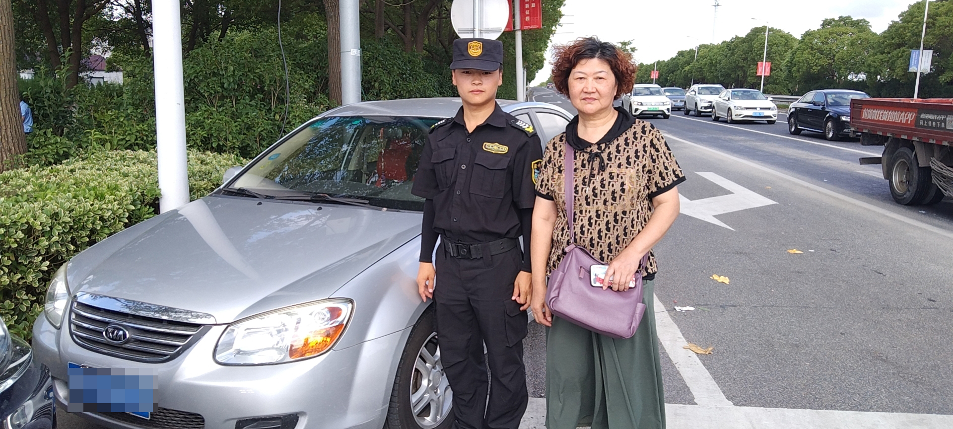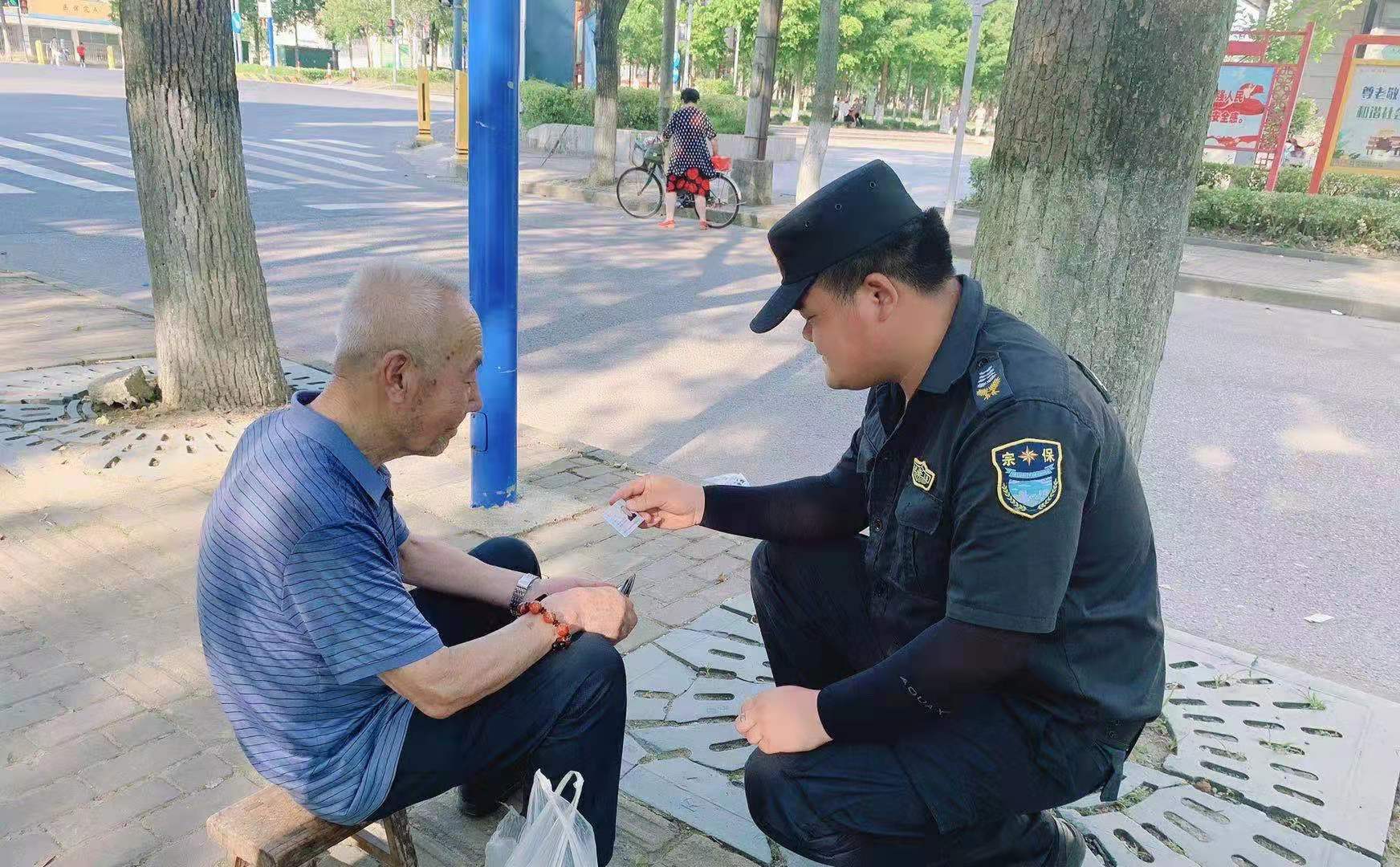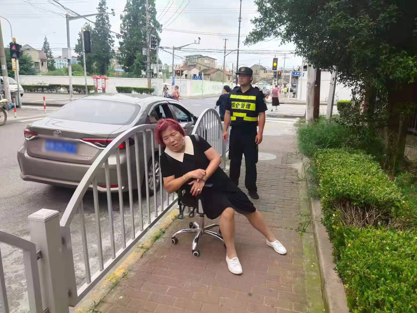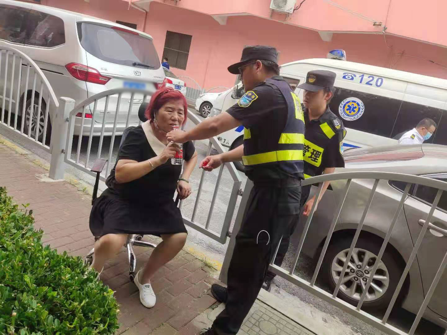 7月14日,宗保公司駐三林市容項目隊員劉大旺熱心幫助身體不適的阿姨。