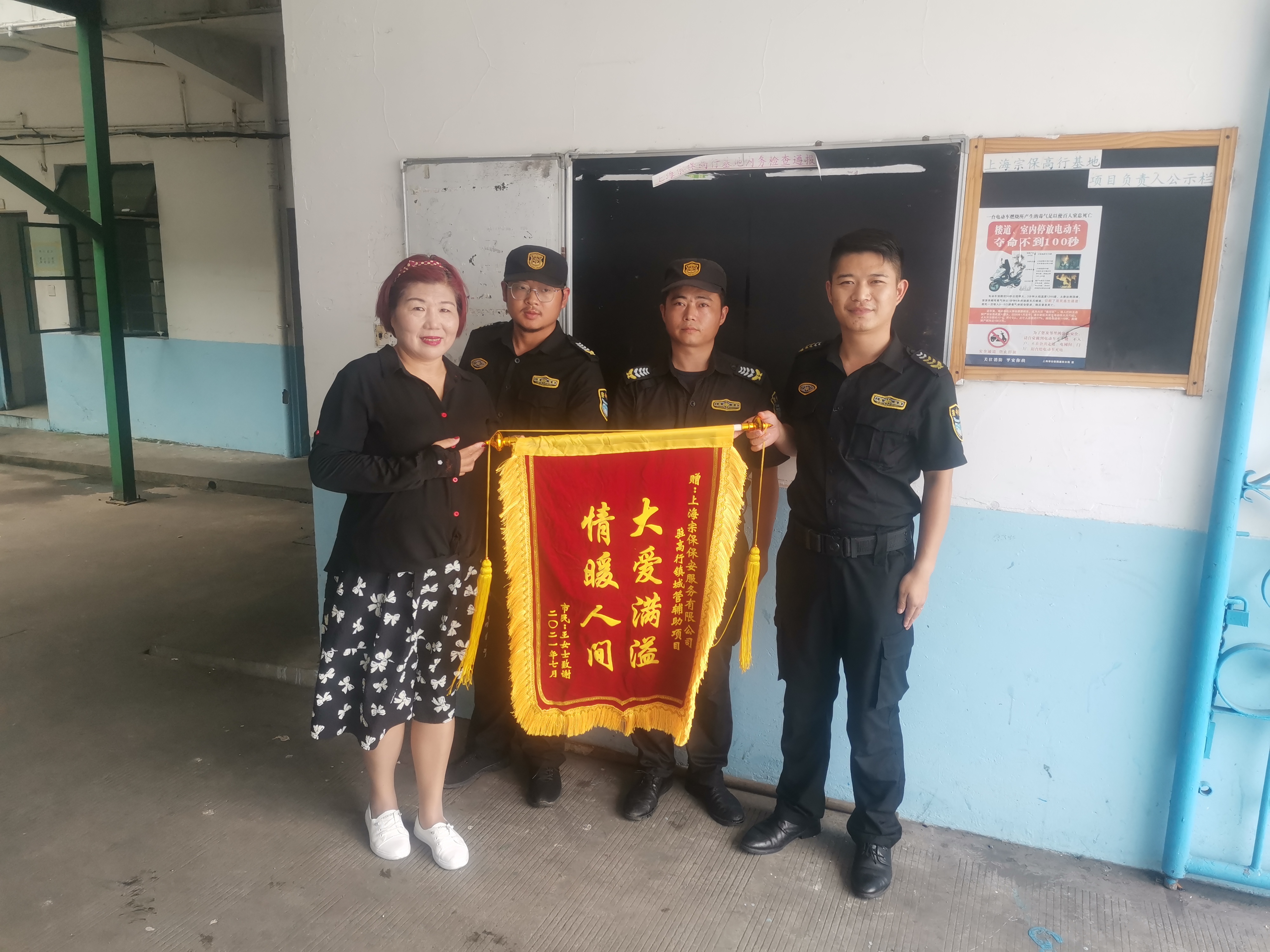 7月29日,市民王女士將一面繡有“大愛滿溢 情暖人間”的錦旗送到宗保公司駐高行市容項目隊員顧俊、蔣云程、蘇開志的手中,感謝他們3人熱心助人的行為。