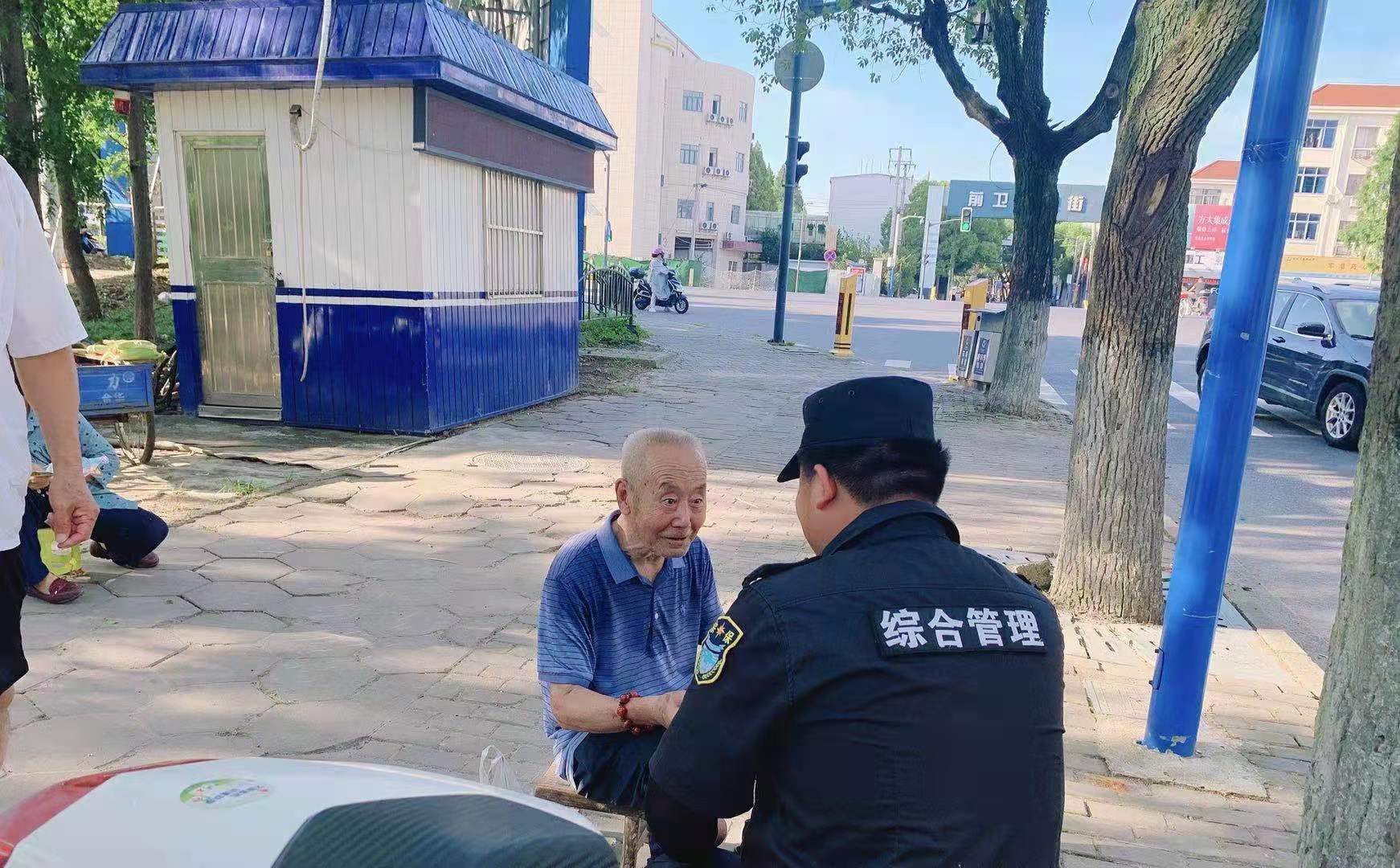 天氣炎熱,老人的整個上衣已經(jīng)濕透,李港軍趕緊找來板凳讓老人先坐下休息,一邊耐心地安撫老人情緒,一邊仔細詢問情況。后來,老人從口袋里掏出一張寫有他兒子電話號碼的紙條,李港軍幫忙聯(lián)系到了其家人。