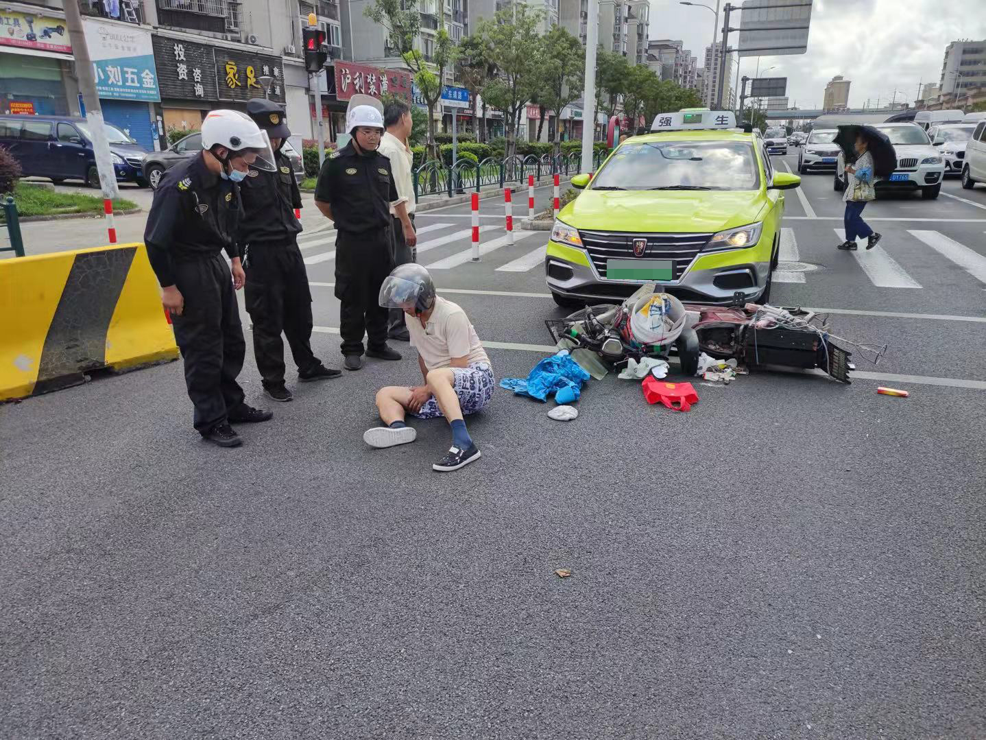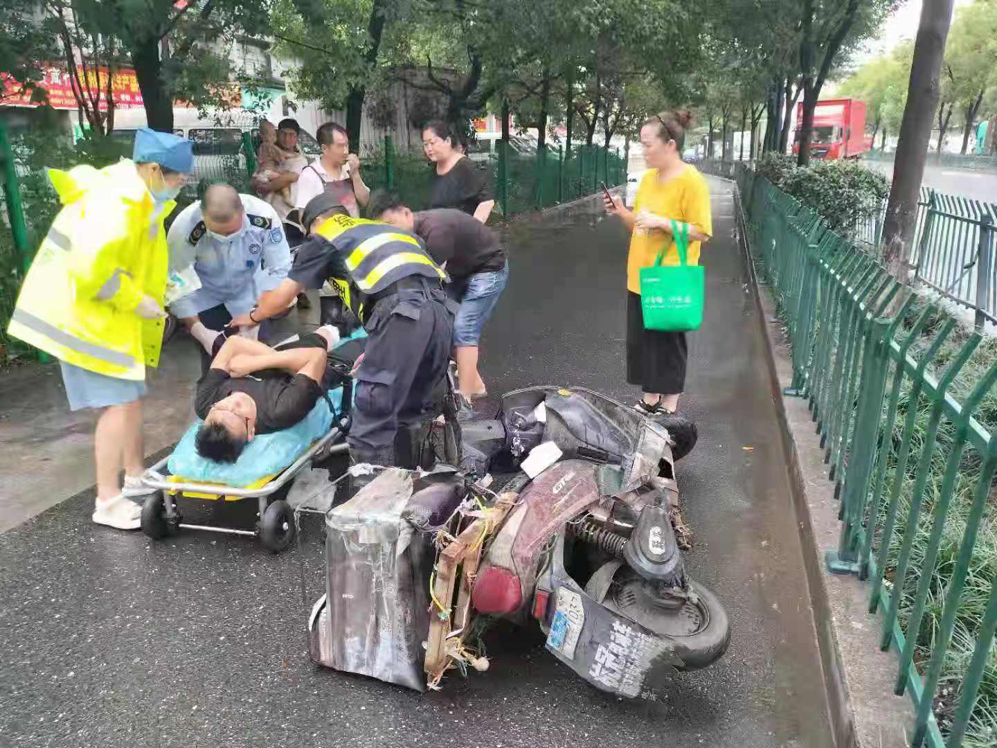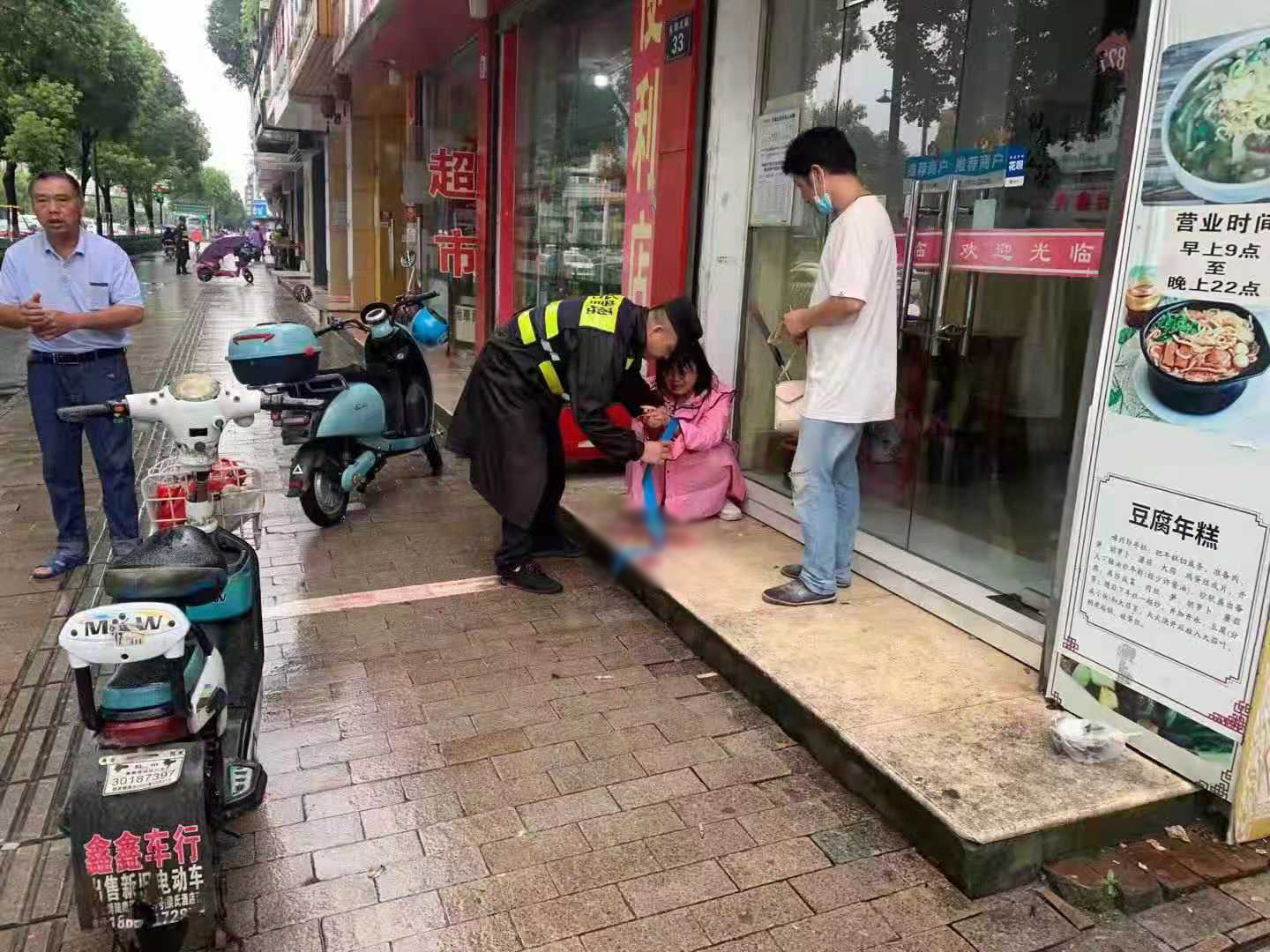 當日9:15,受臺風影響,天氣陰雨綿綿,路面積水濕滑。李建軍、沈明銳巡邏至東湖北路與星光街路口時,看到一位騎電瓶車小姑娘摔倒在地,就立即上前查看。