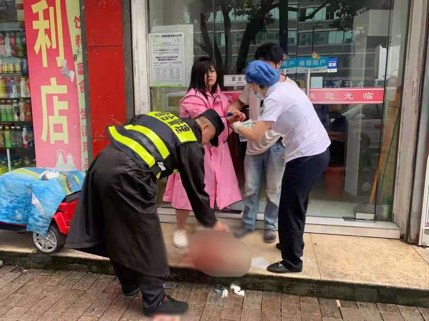 7月27日,浙江民泰駐東湖市容項目隊員熱心幫助騎車摔倒受傷的姑娘。