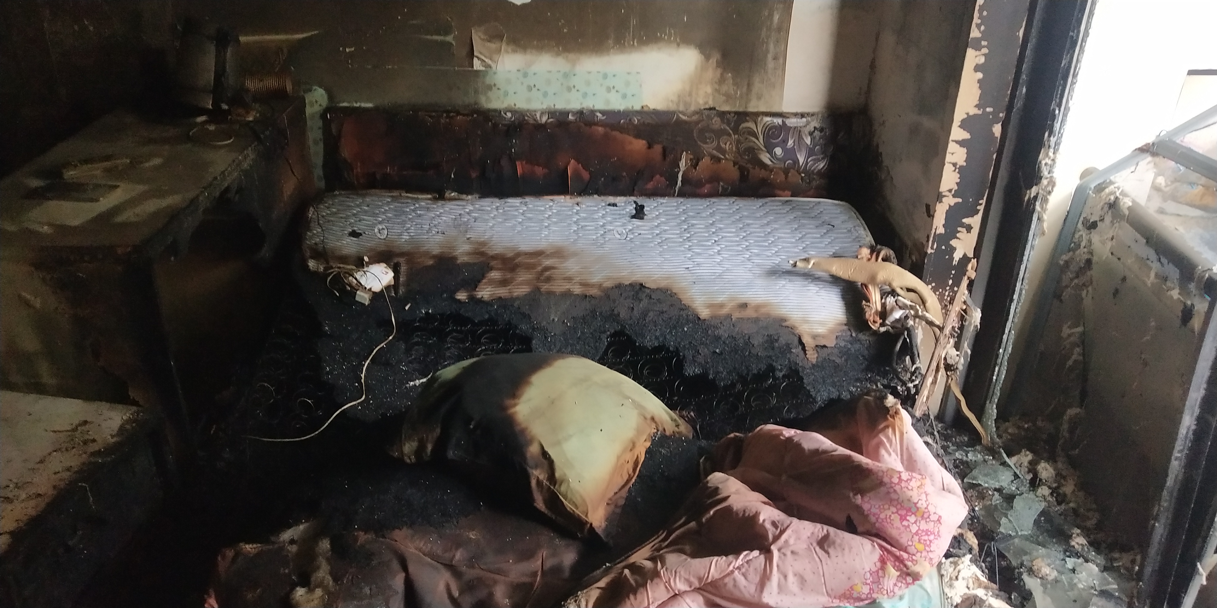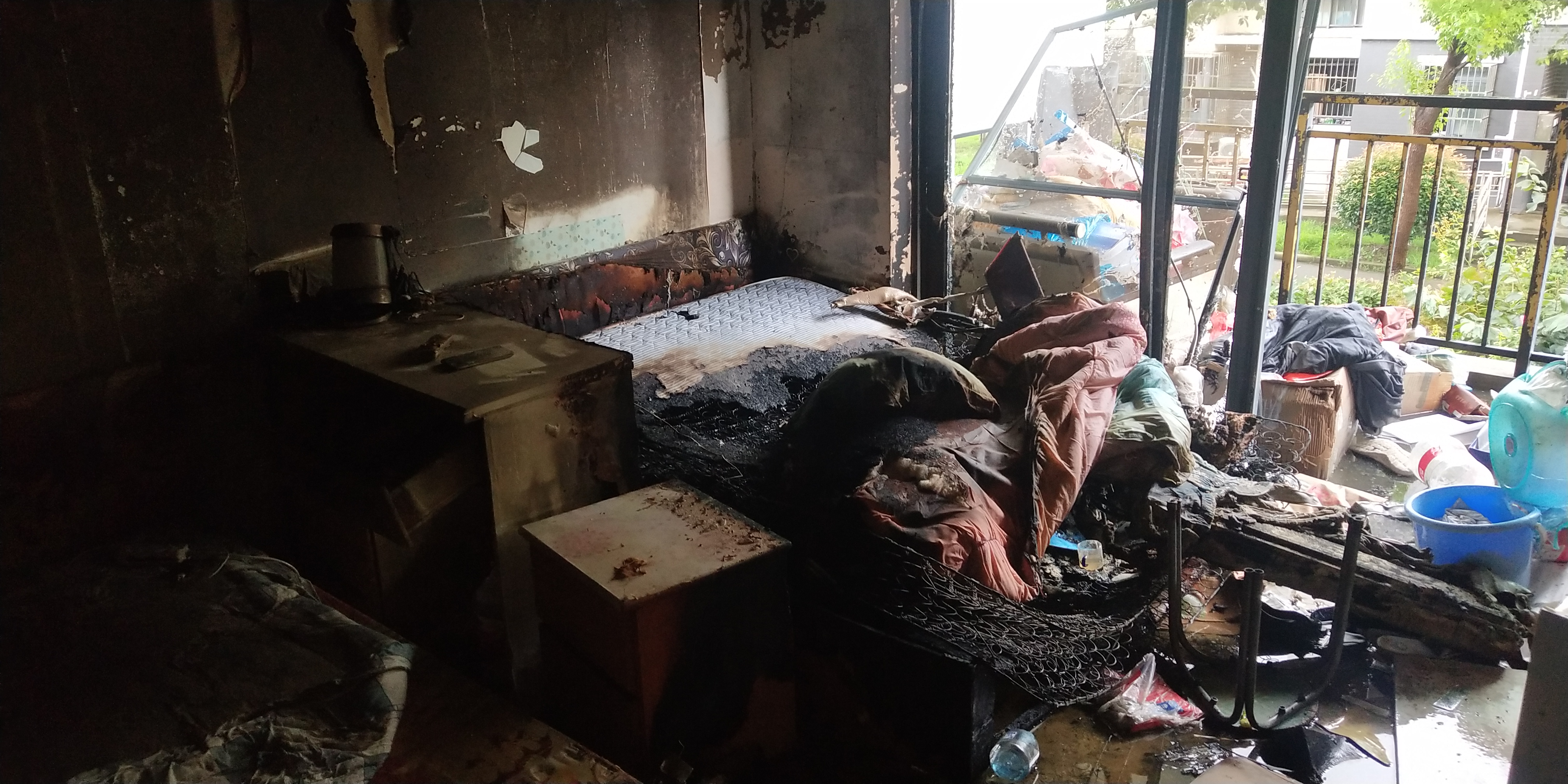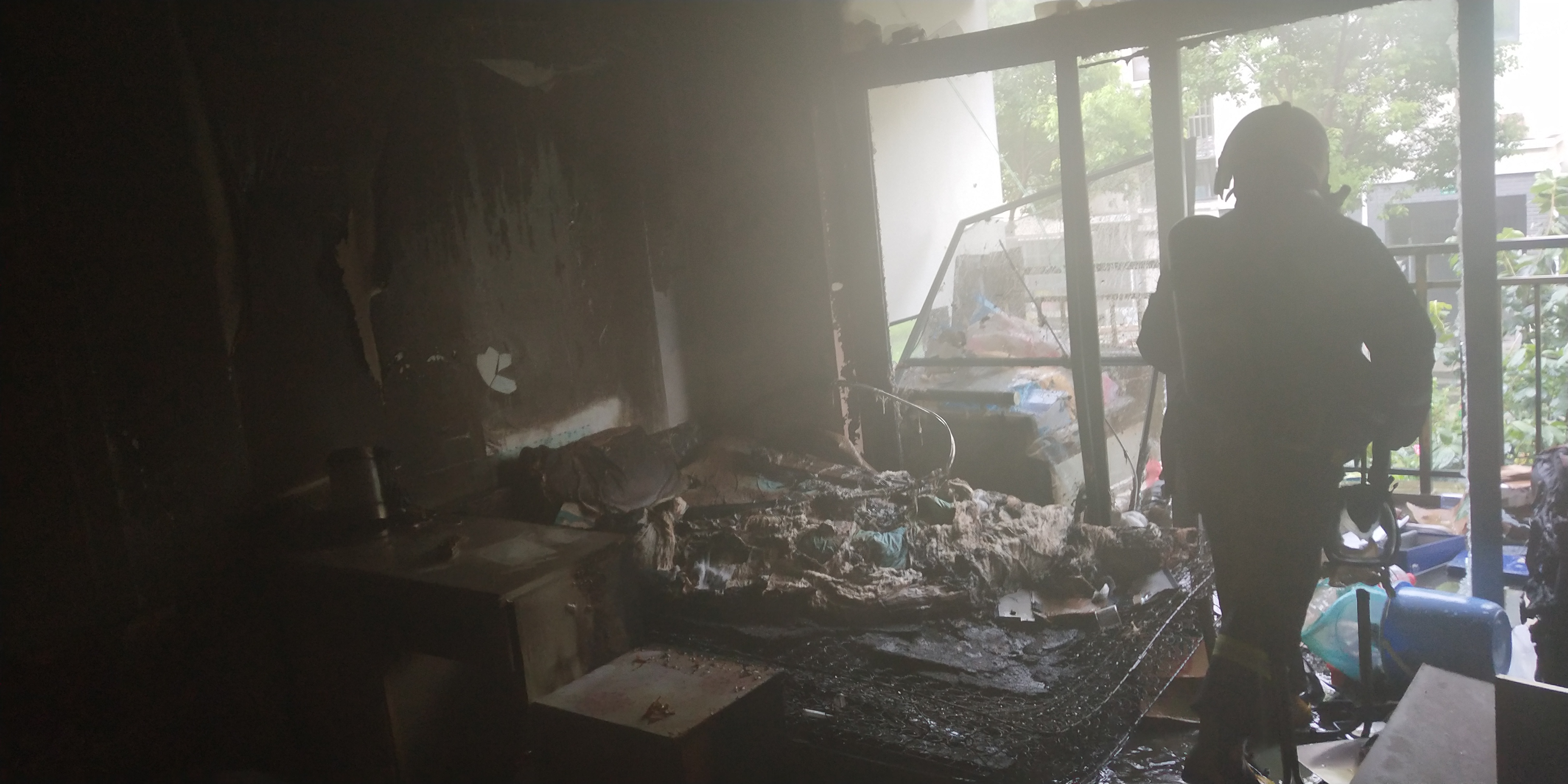 經(jīng)確認現(xiàn)場沒有人員被困后,在現(xiàn)場保安人員的配合下,立即切斷電源開關,鎖定房間床上物品著火源,利用樓道墻上消火栓對準火源噴射,直至火源徹底熄滅。消防救援隊人員也很快趕到現(xiàn)場,社區(qū)微型消防站人員與他們進行了交接,將現(xiàn)場滅火情況向他們作了匯報。