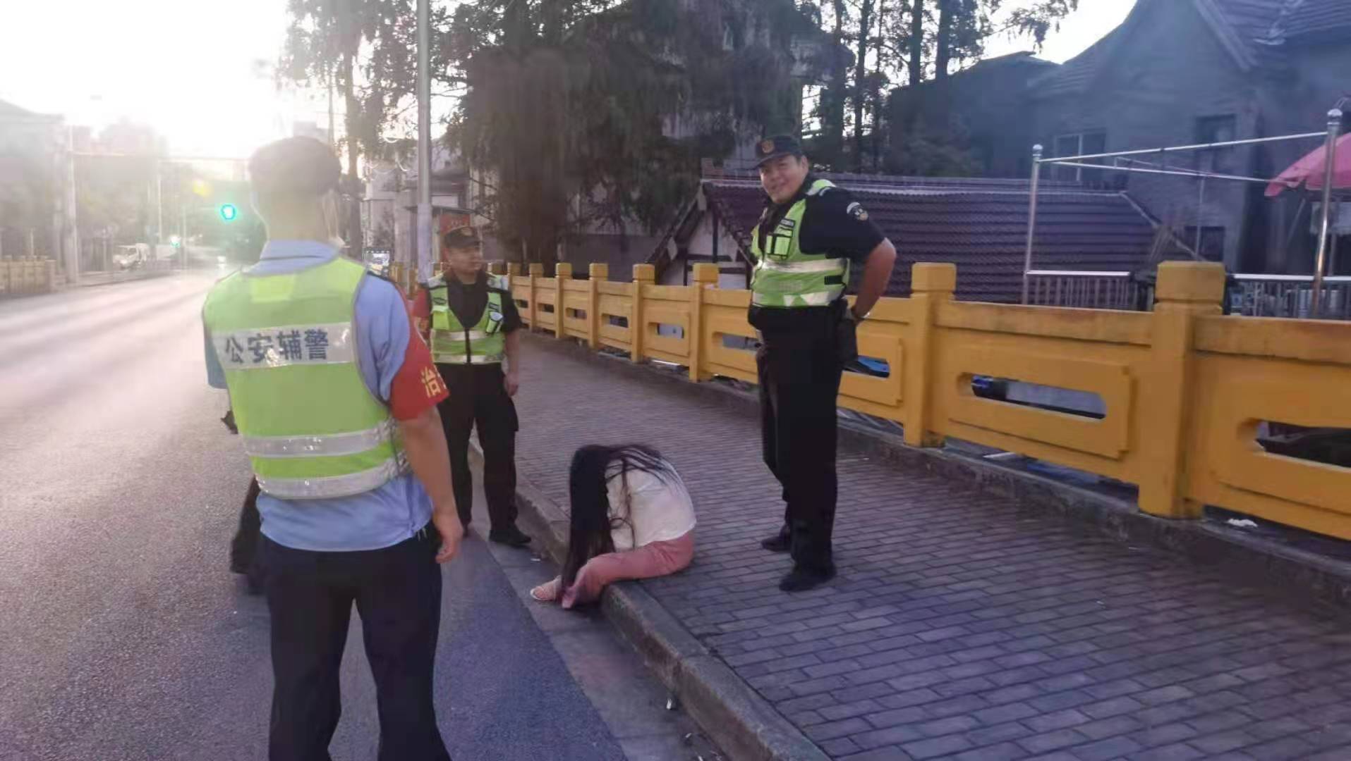 當(dāng)天凌晨5:05,李武召、王楷迪、張永熠巡邏至周市路祝家港路祝家港橋時(shí),發(fā)現(xiàn)一名大約20歲左右、身穿白色短袖、粉色褲子的醉酒女子坐在地上,一邊打視頻電話,一邊大聲哭叫,情緒顯得非常激動(dòng)。