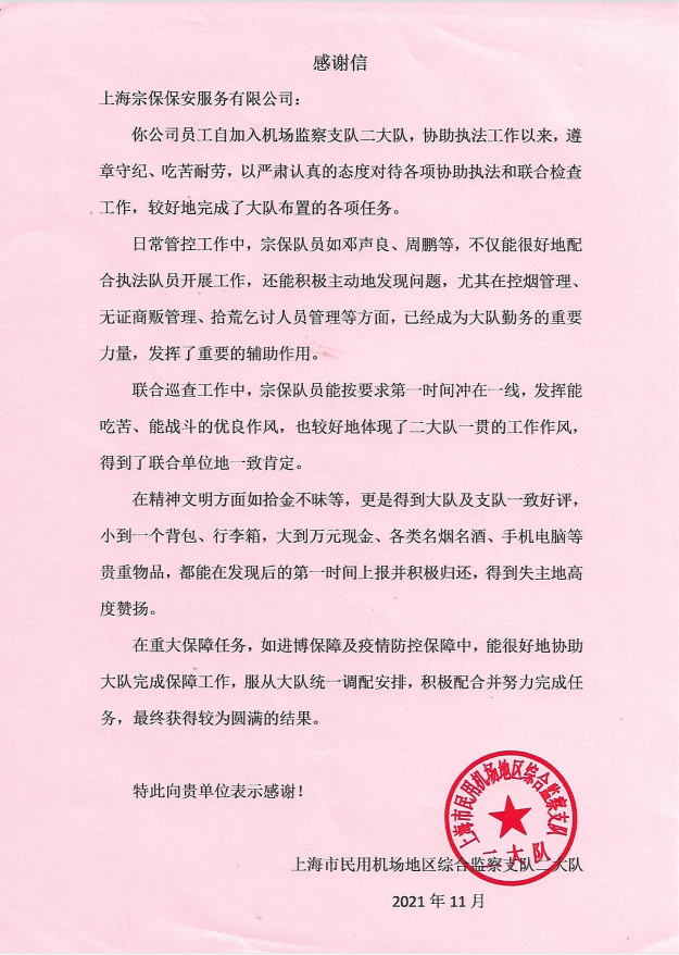 11月15日,宗保公司駐機(jī)場防疫項目收到上海市民用機(jī)場地區(qū)綜合監(jiān)察支隊二大隊送來的感謝信,信中對項目隊員們的良好工作表現(xiàn)給予了充分肯定。
