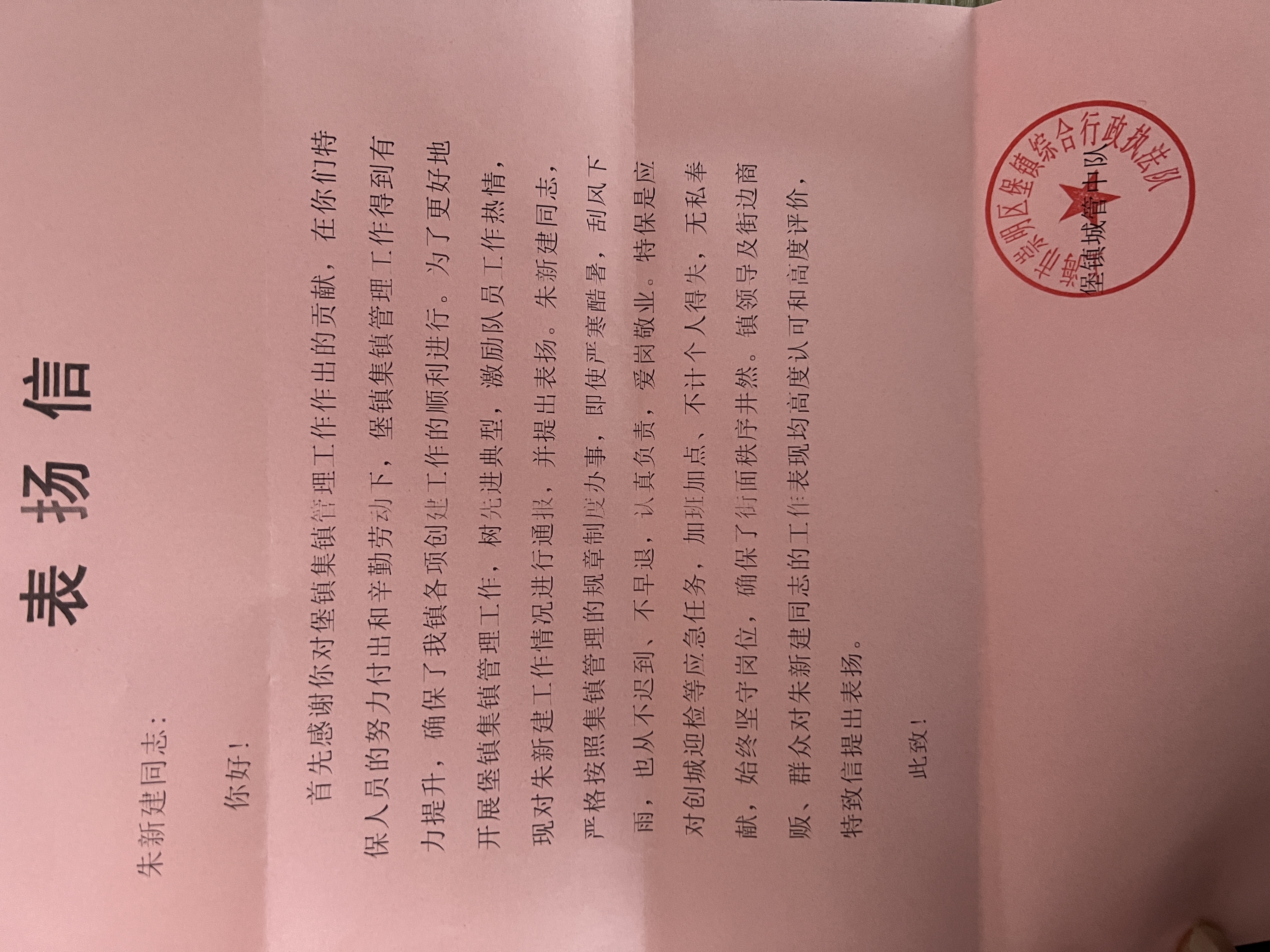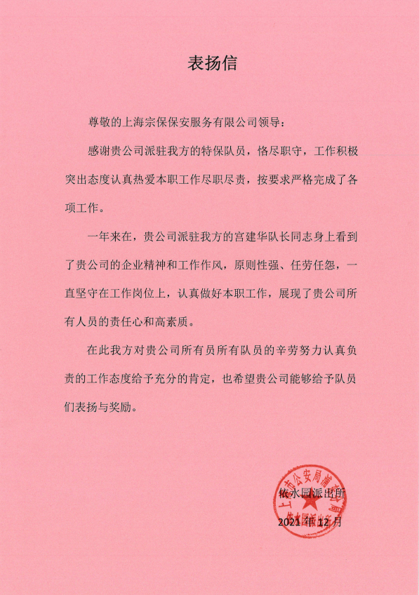 12月24日,宗保公司駐崇明堡鎮(zhèn)項目收到堡鎮(zhèn)城管中隊的表揚信,信中對宗保隊員朱新建盡心履責的工作表現提出特別表揚。