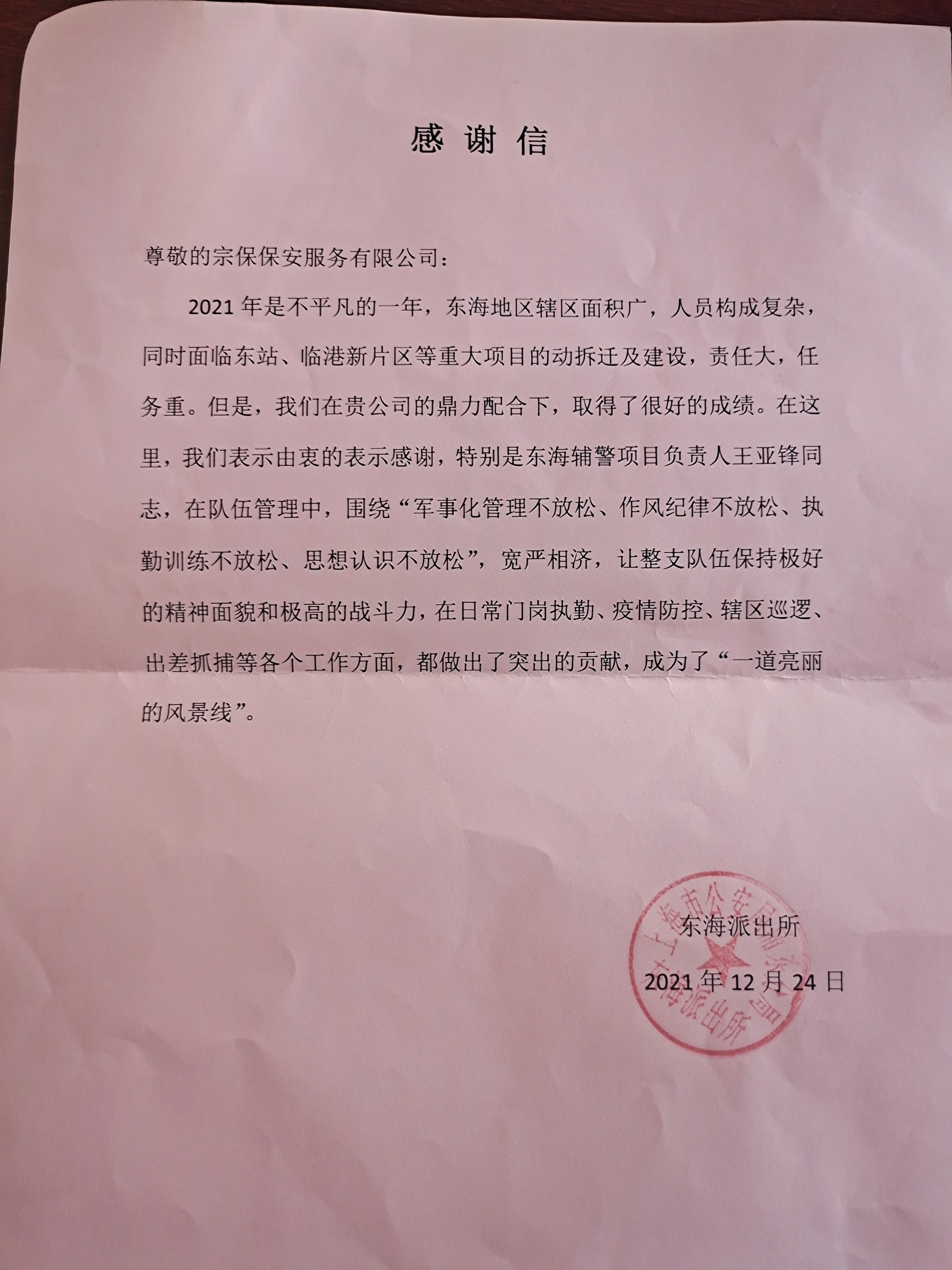 12月24日,宗保公司駐東海派出所輔警項目收到東海派出所的感謝信,信中表揚宗保隊員王亞鋒出色的工作表現。