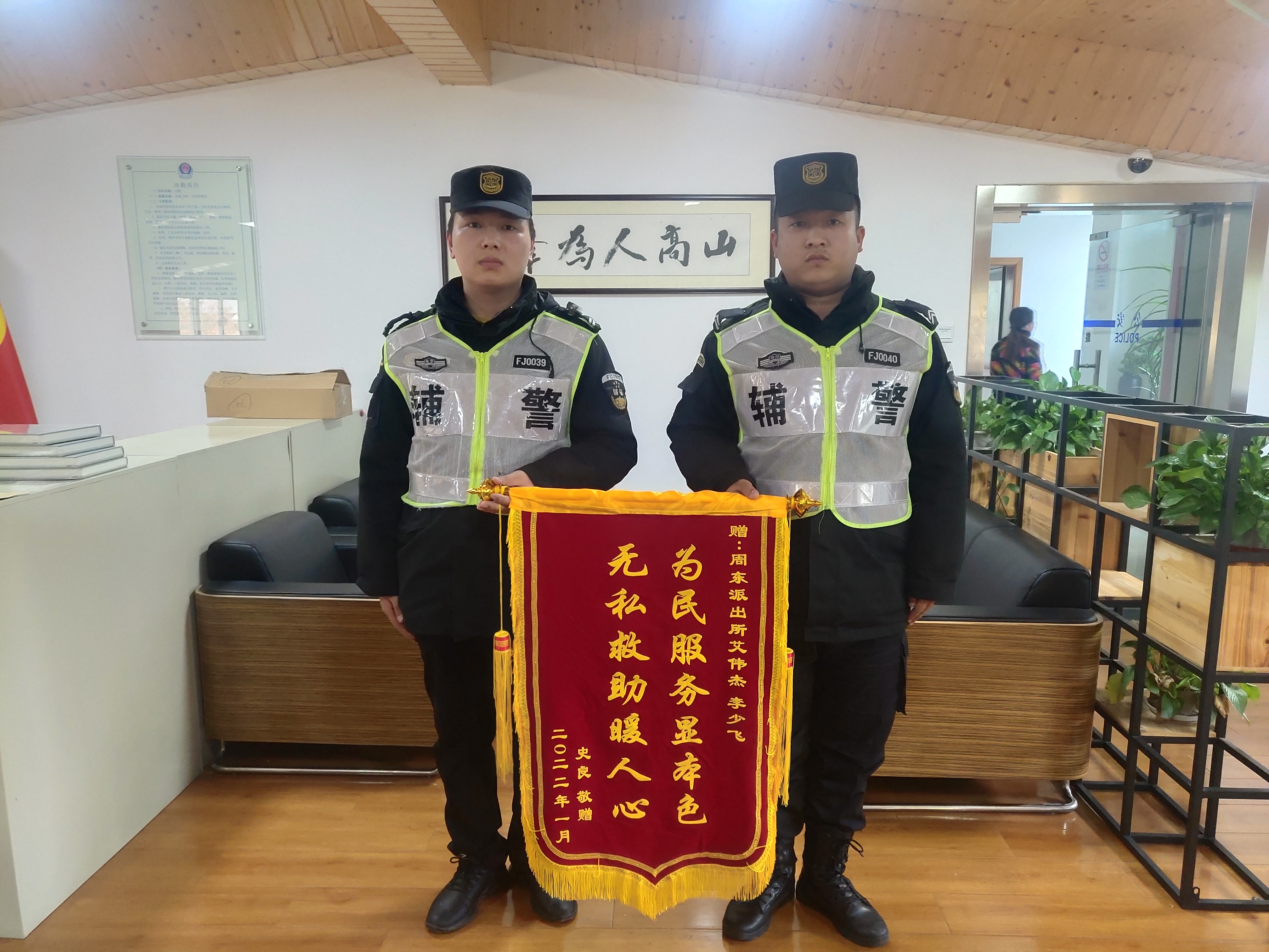 1月12日,宗保公司駐周東輔警項(xiàng)目隊(duì)員艾偉杰和李少飛收到一面繡有“為民服務(wù)顯本色 無私救助暖人心”的錦旗。