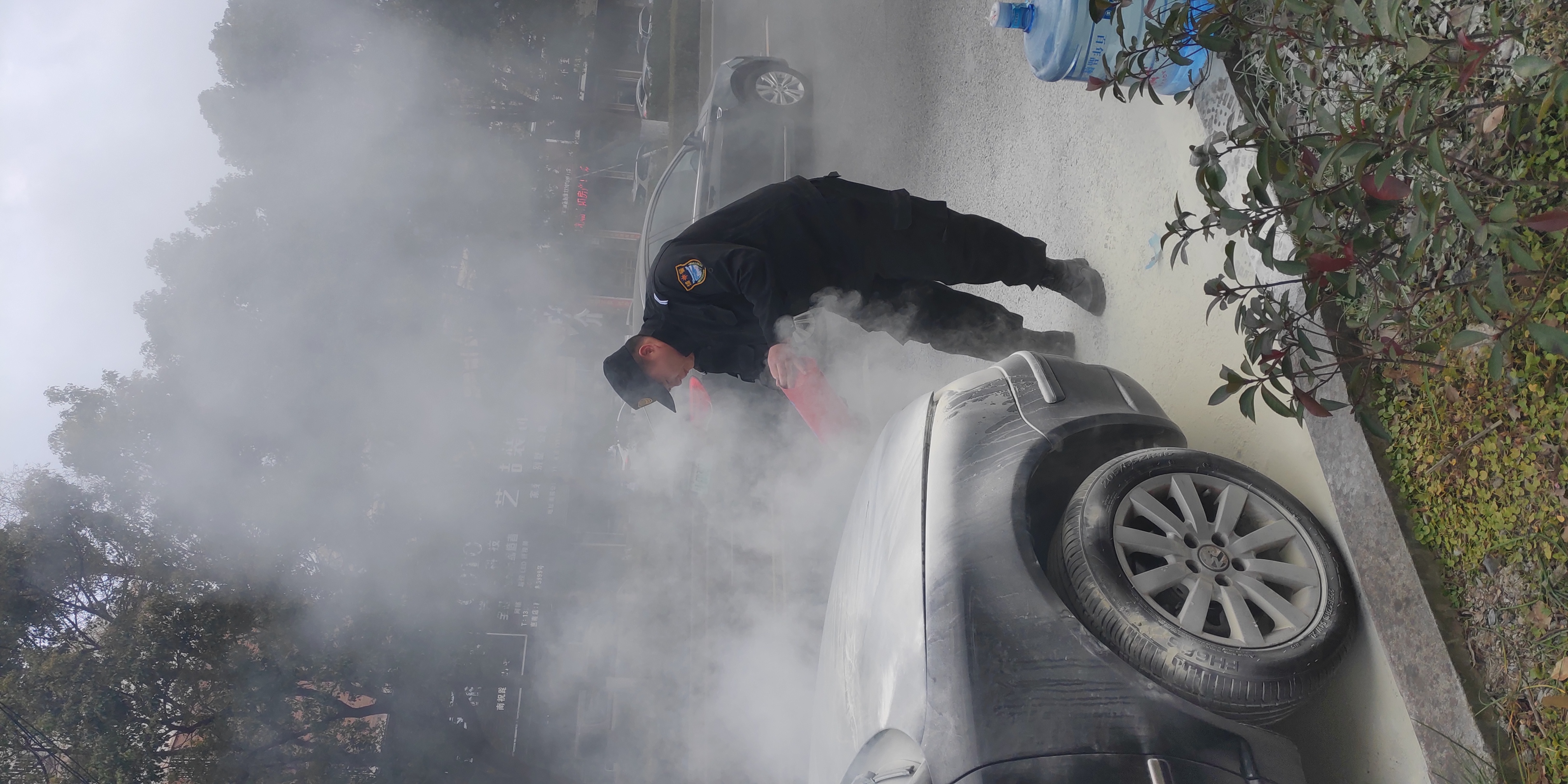 1月4日,宗保公司駐惠南輔警項(xiàng)目隊(duì)員朱亞利和張喜幫助撲滅自燃車輛。