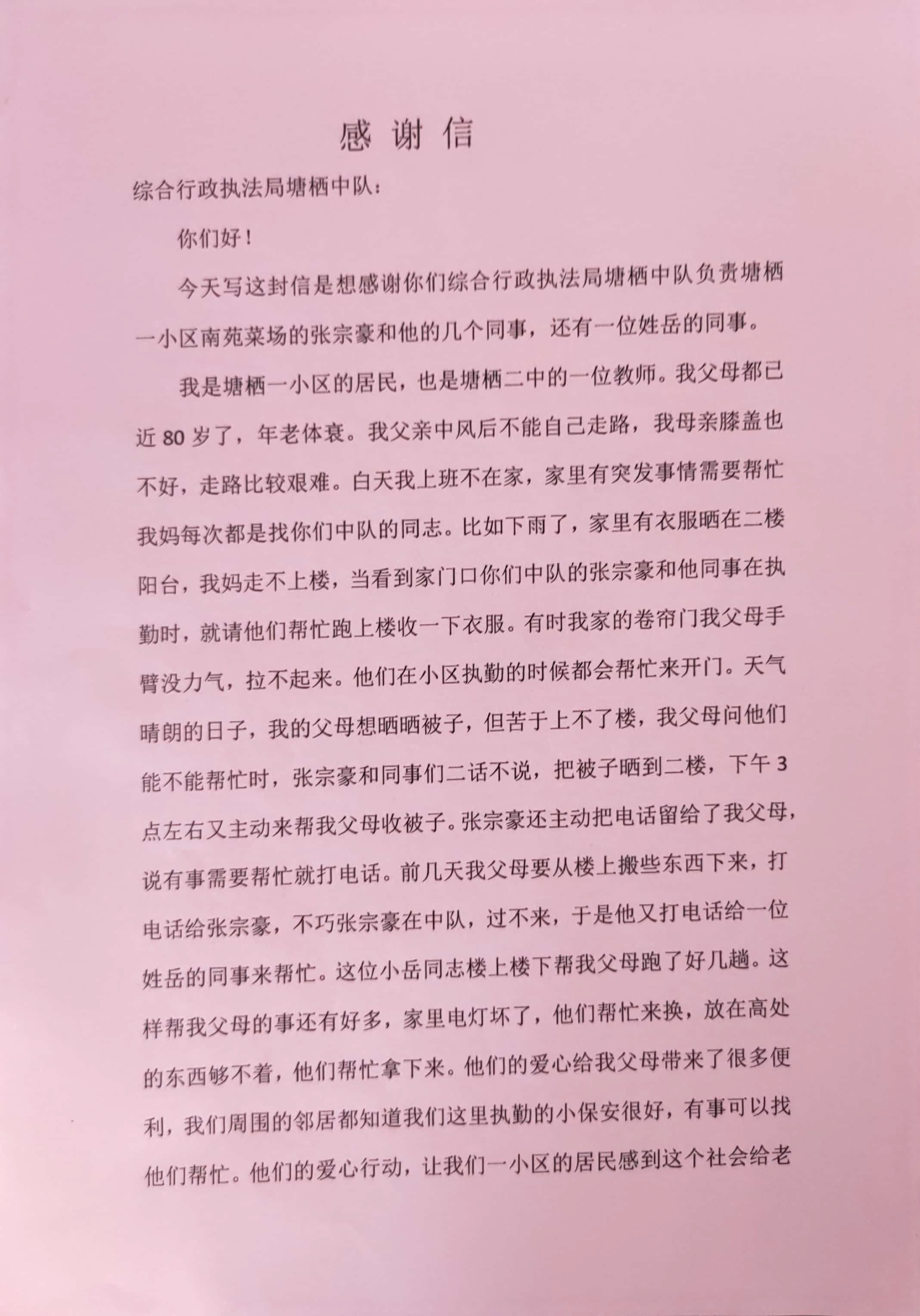 平凡民泰人 善舉暖人心—塘棲市容項(xiàng)目收到感謝信