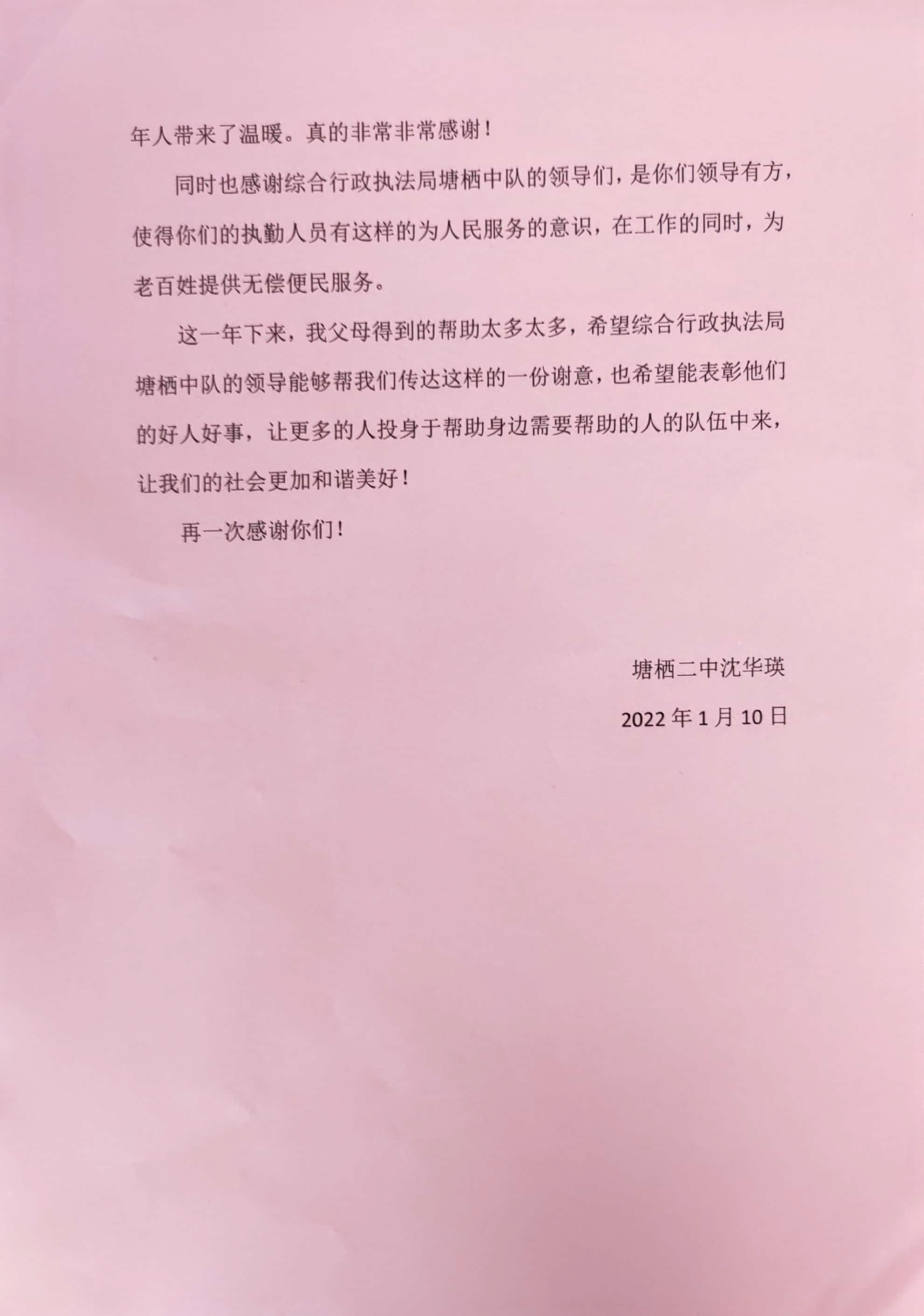 1月10日,浙江民泰駐塘棲市容項(xiàng)目收到塘棲二中沈華瑛老師的感謝信,信中對民泰隊(duì)員熱心幫助其父母的行為表示感謝。