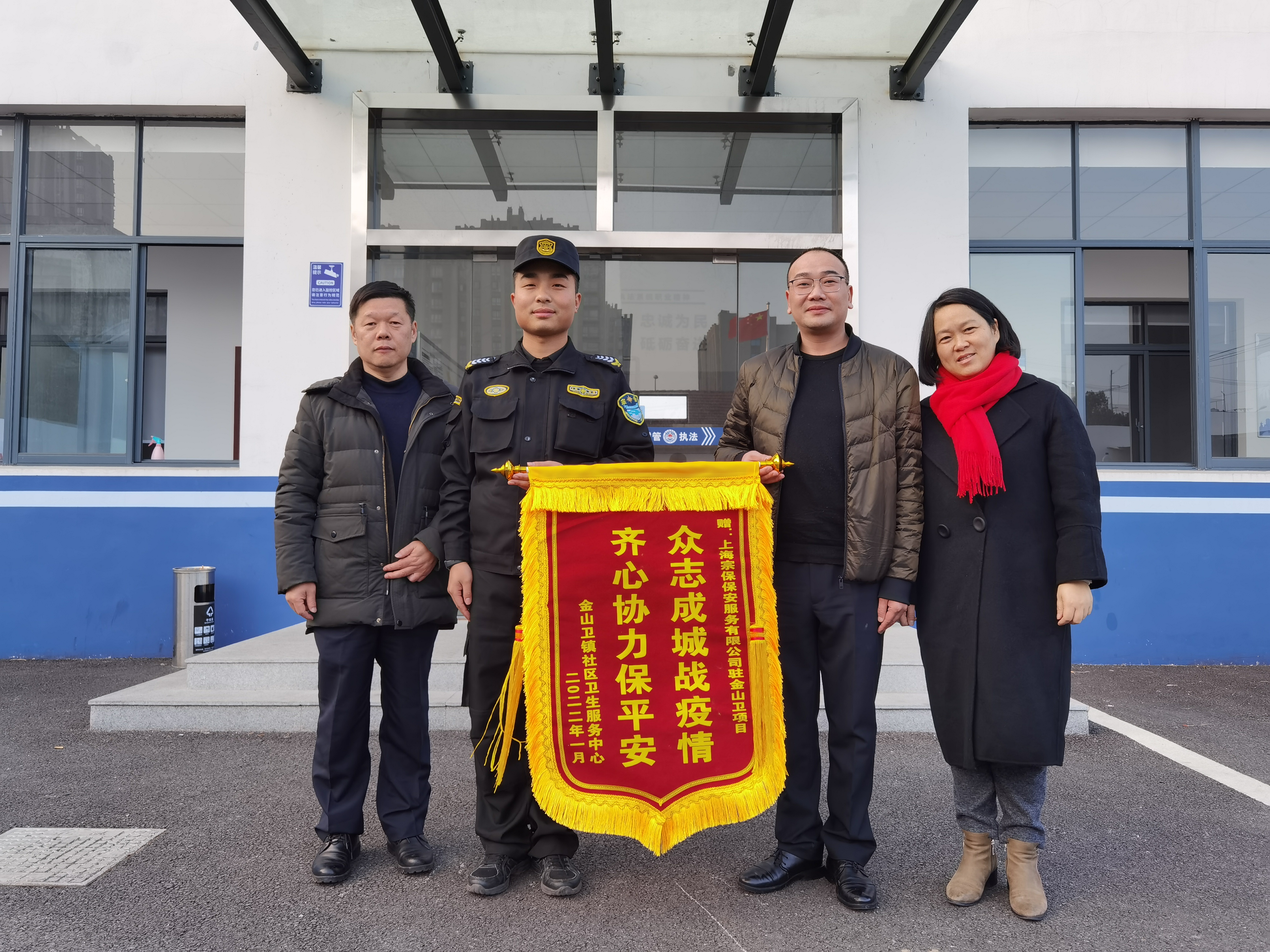 1月18日,金山衛(wèi)社區(qū)衛(wèi)生服務(wù)中心高浩美院長將繡有“眾志成城戰(zhàn)疫情 齊心協(xié)力保平安”的錦旗送到宗保公司駐金山衛(wèi)項目,表揚(yáng)宗保隊員出色的工作表現(xiàn)。