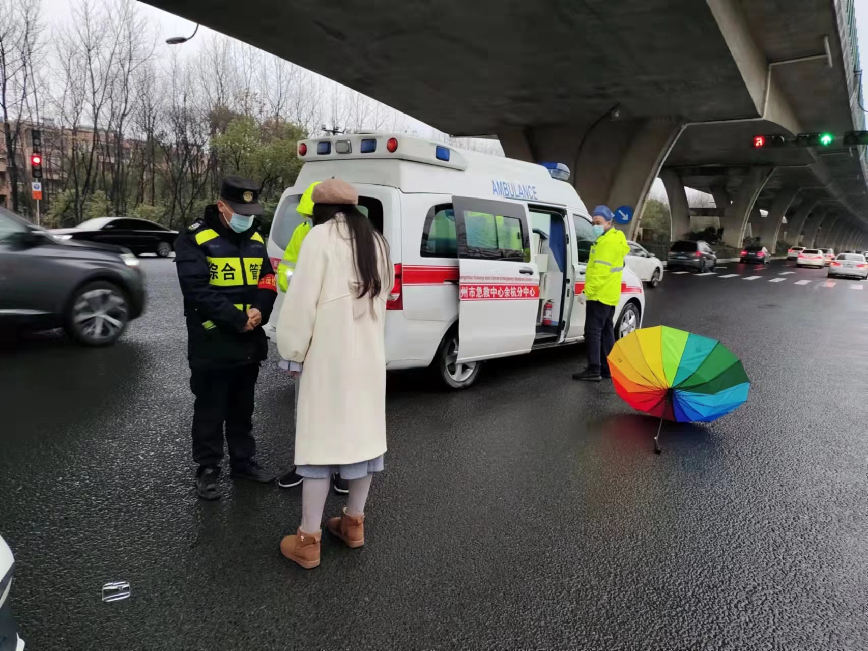 很快,救護(hù)車趕到現(xiàn)場(chǎng),兩人又協(xié)助醫(yī)護(hù)人員將受傷女子抬上救護(hù)車,送往醫(yī)院救治。救護(hù)車走后,兩人仍在現(xiàn)場(chǎng)維護(hù)交通,并協(xié)助趕到現(xiàn)場(chǎng)的民警進(jìn)行事故處理。