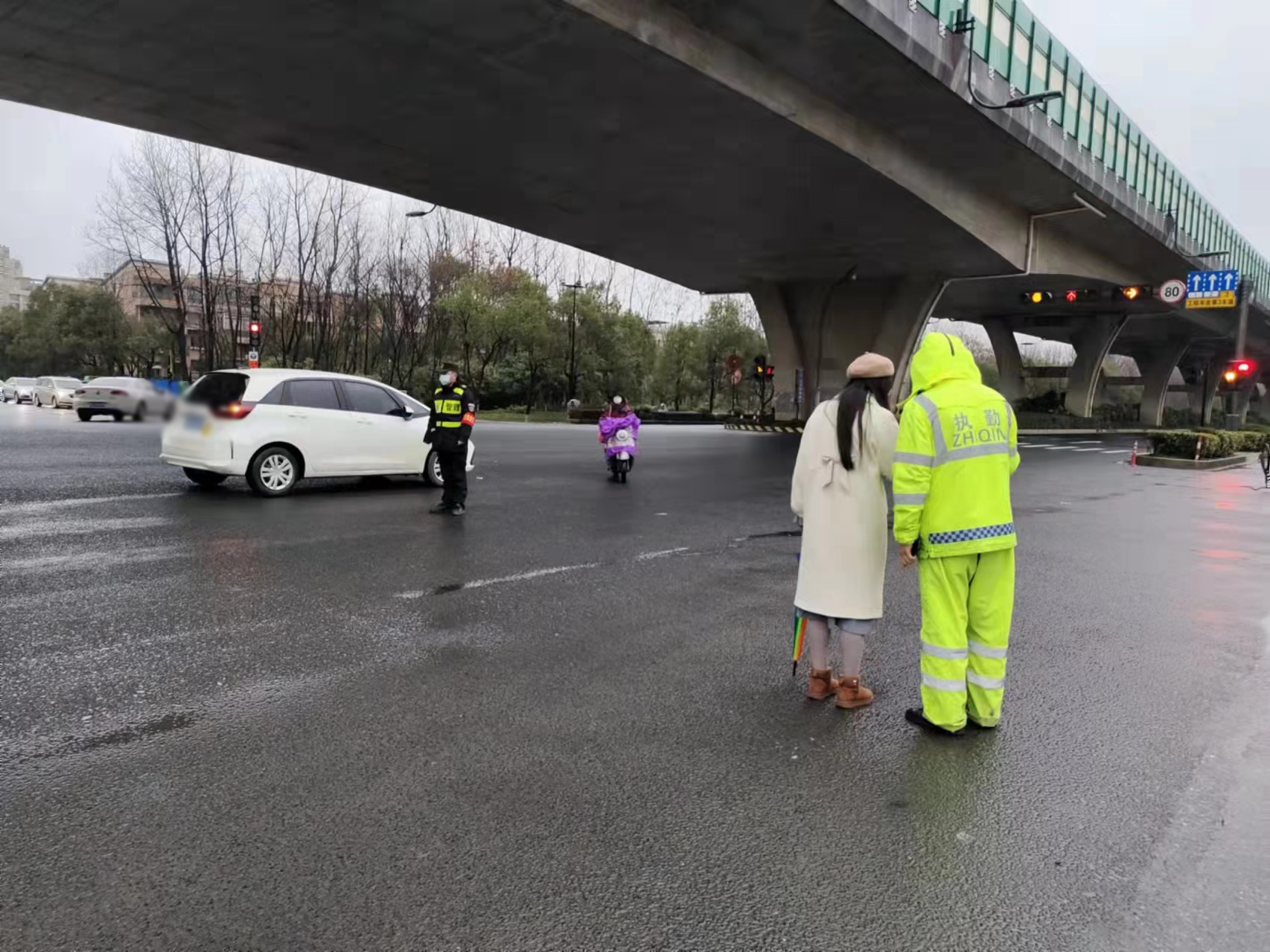 事故地位于十字路口處,車流量較大,隨時(shí)有可能發(fā)生二次事故,情況緊急,兩人見狀迅速進(jìn)行分工,呂劍強(qiáng)上前負(fù)責(zé)引導(dǎo)車輛有序通過,宋亭負(fù)責(zé)看護(hù)受傷女子,同時(shí)提醒轎車司機(jī)撥打120急救電話,并將情況上報(bào)項(xiàng)目負(fù)責(zé)人。