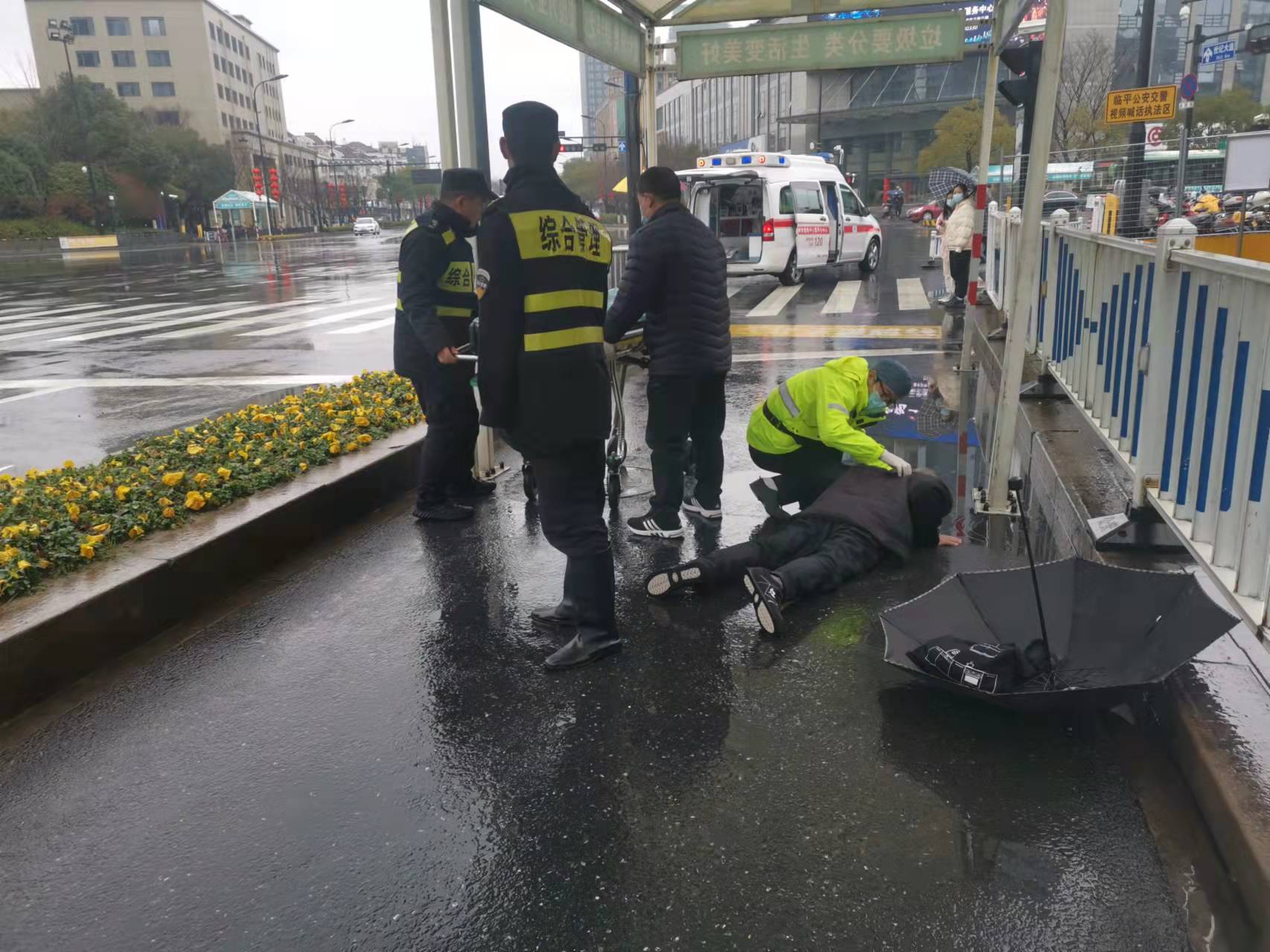 當(dāng)日中午12:25,張帥帥、李佺在地鐵9號(hào)線臨平站A出口附近巡邏時(shí),發(fā)現(xiàn)一位老人因路滑摔倒在地,一時(shí)無法動(dòng)彈。兩人見此情況趕緊上前詢問,老人表示自己剛才走路時(shí)不小心摔倒了,腿部很疼、暫時(shí)無法起身。情況緊急,經(jīng)老人同意后,及時(shí)趕到現(xiàn)場(chǎng)的班組長(zhǎng)司曉偉撥打了120急救電話。
