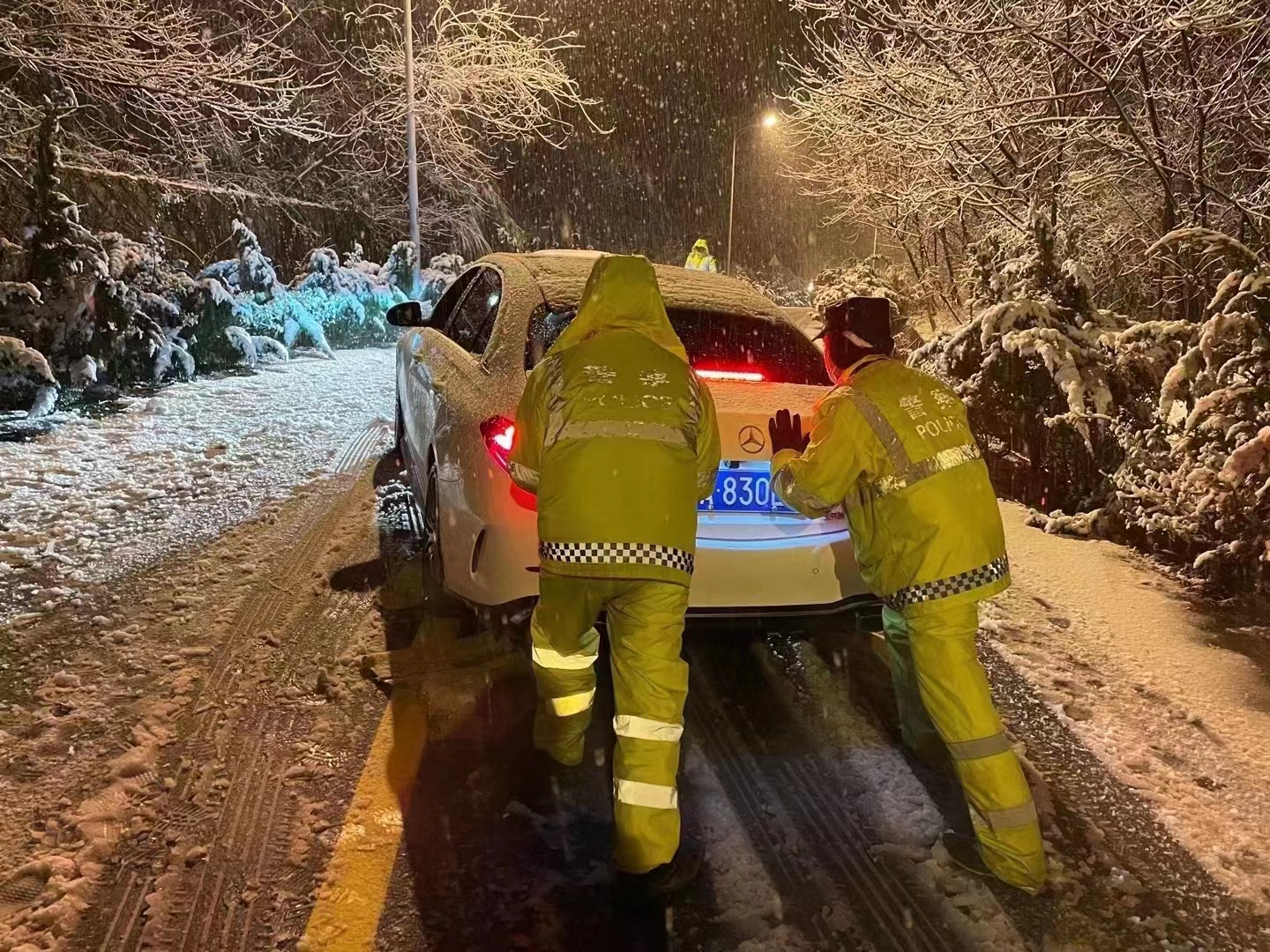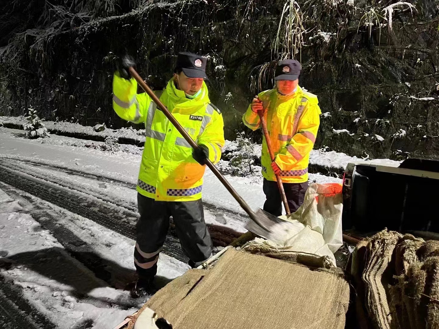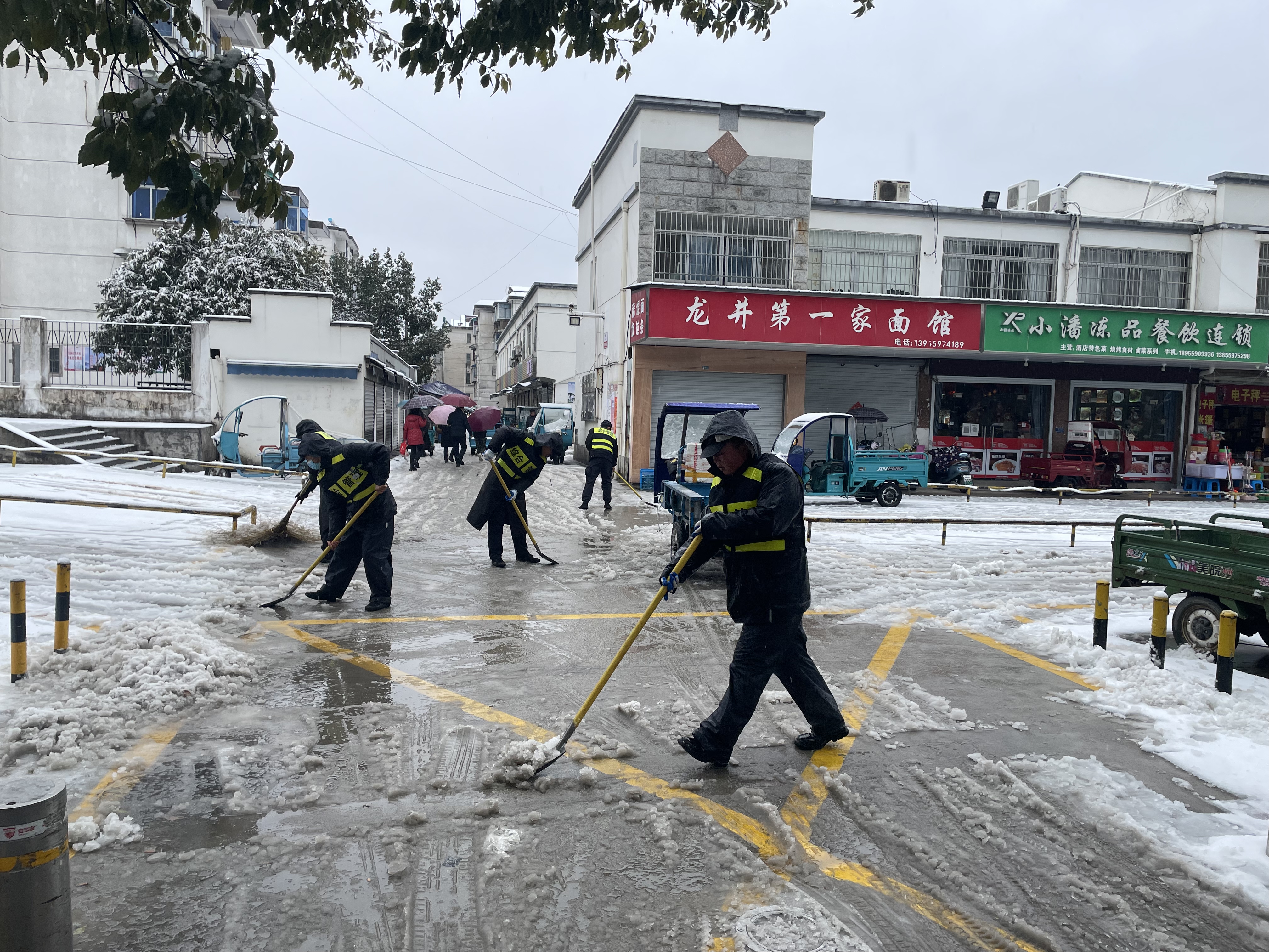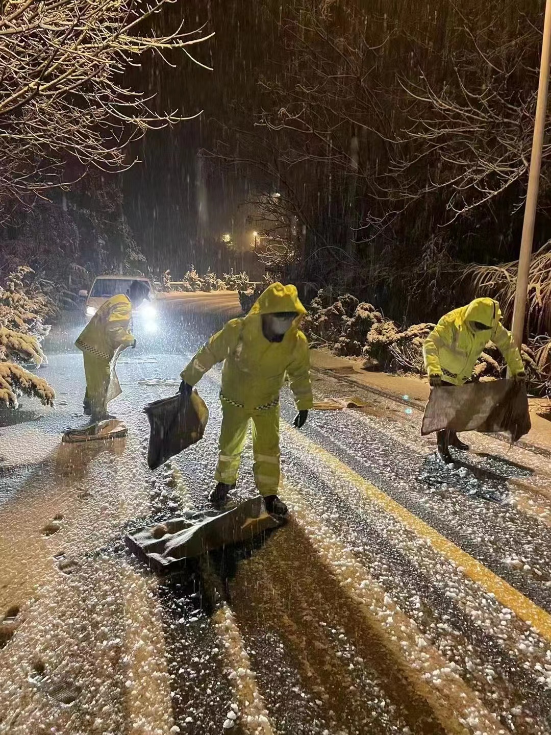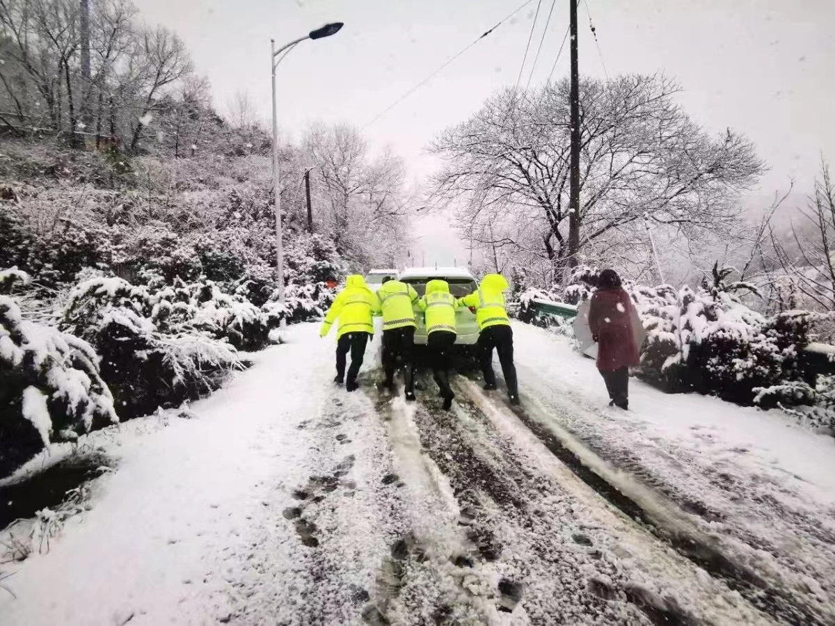 隊(duì)員們頂著寒風(fēng),不畏嚴(yán)寒,齊心協(xié)力,相互配合,揮舞著鐵锨、掃把等工具,對(duì)重點(diǎn)場(chǎng)所主要出入口、鎮(zhèn)區(qū)主干道、人行道等區(qū)域的積雪進(jìn)行清理;在上山傾斜路段開展撒鹽化雪、鋪草墊、除路障、設(shè)置醒目防滑標(biāo)志、幫助因雪受困車輛脫困等工作……直至凌晨一點(diǎn)清雪除冰工作才暫時(shí)告一段落。