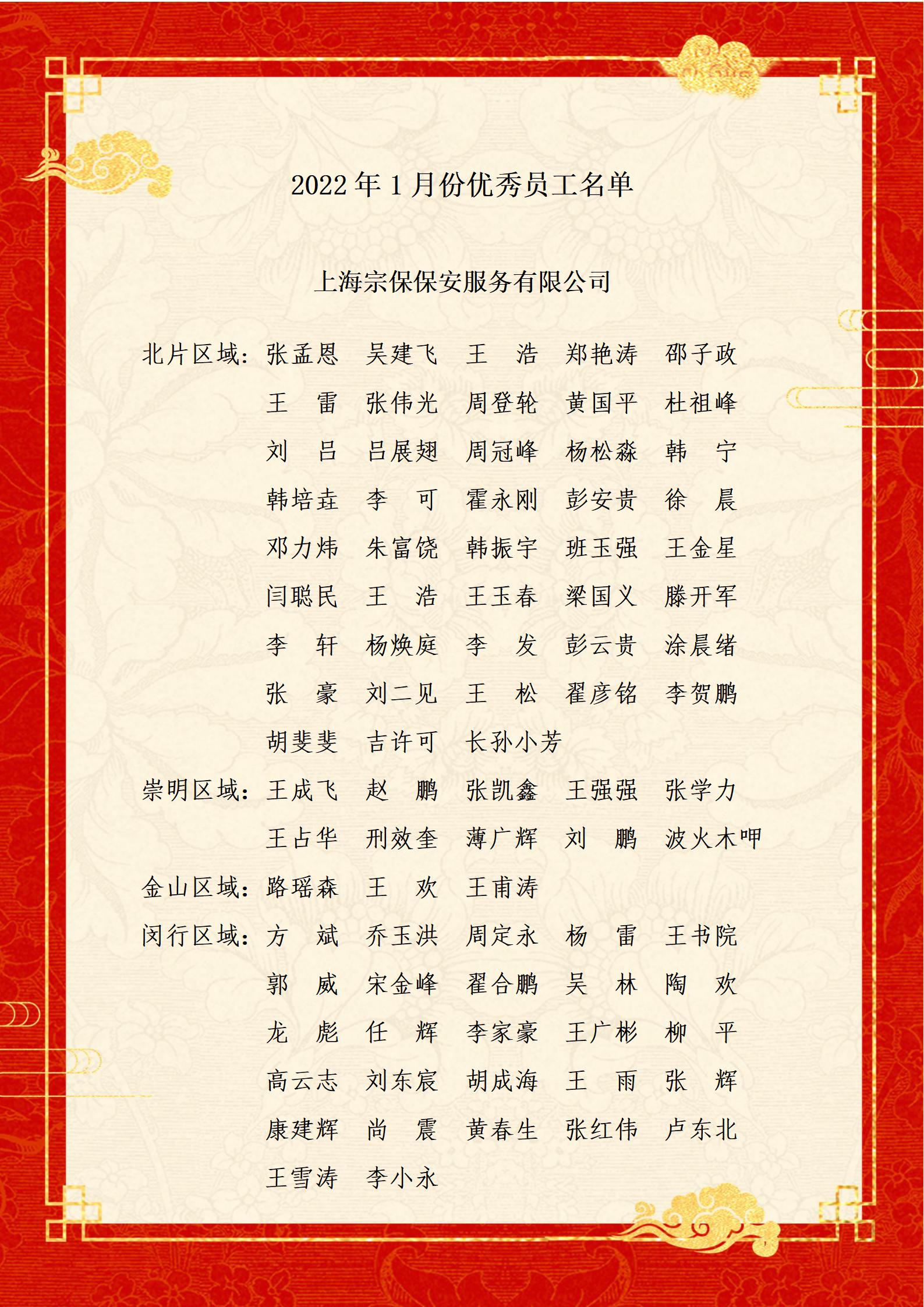 1月份,公司廣大員工根據(jù)甲方的工作部署,按照公司的工作要求,秉承不懼風(fēng)險、勇毅前行、連續(xù)奮戰(zhàn)的工作作風(fēng),堅守疫情防控一線,協(xié)助完成臨港新片區(qū)元旦煙花秀技防保障、景區(qū)大客流保障、清除外來物種、掃雪除冰等任務(wù),多個項目和隊員獲得表彰。期間,涌現(xiàn)出了一批盡心履責(zé)、崗位建功、拾金不昧、助人為樂的優(yōu)秀員工和先進(jìn)典型。