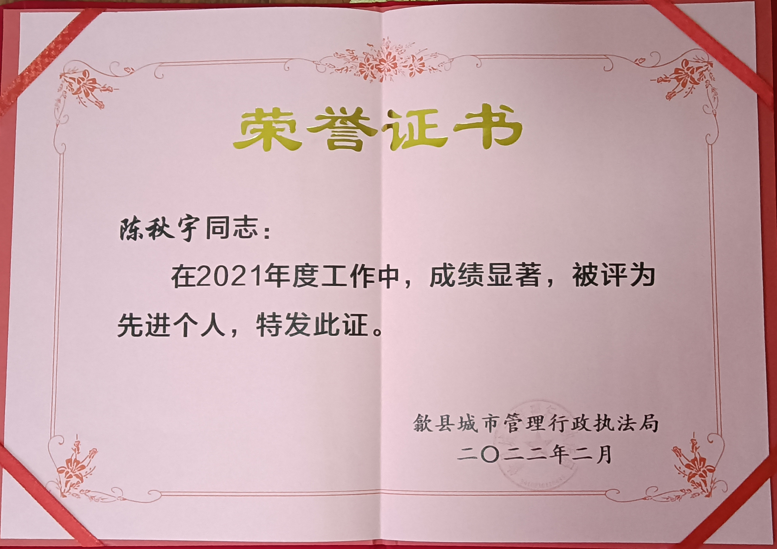2022年2月14日,歙縣城管執(zhí)法局召開(kāi)城市管理工作會(huì)議。公司駐歙縣市容項(xiàng)目隊(duì)被歙縣城市管理行政執(zhí)法局評(píng)為“2021年度先進(jìn)集體”,項(xiàng)目隊(duì)員江大斌、陳秋雨被評(píng)為“先進(jìn)個(gè)人”。