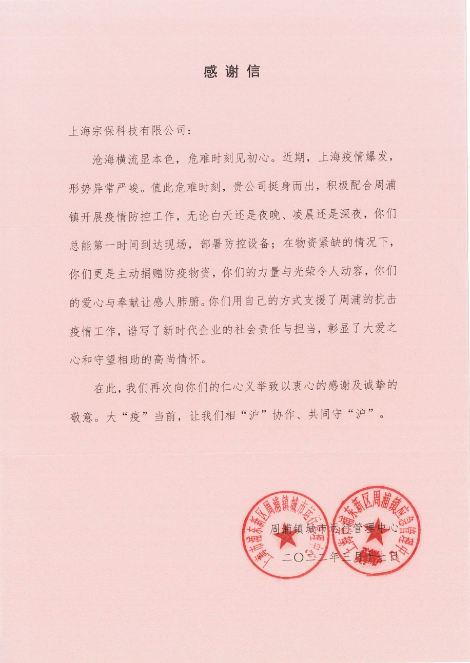 3月17日,上海宗保科技有限公司收到周浦鎮(zhèn)城市運行管理中心和周浦鎮(zhèn)應(yīng)急管理中心的感謝信,感謝宗保科技對周浦鎮(zhèn)疫情防控工作的大力支持。
