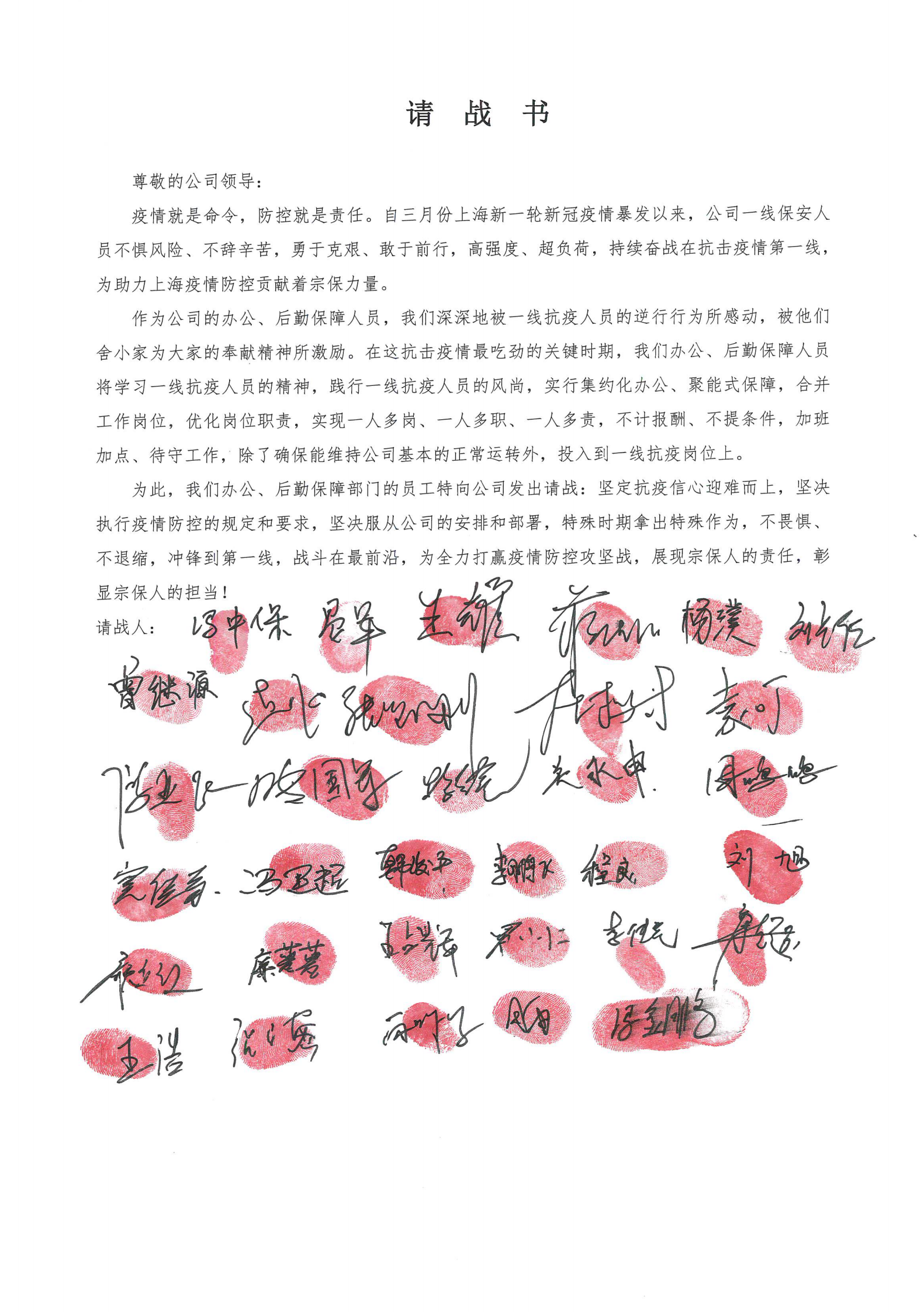 公司辦公室、后勤保障人員主動請纓,紛紛向公司遞交請戰(zhàn)書,簽上自己的名字,摁下自己的手印,請求到最艱苦、最危險的崗位上去。公司創(chuàng)始人馮中保與公司高管、辦公室、后勤保障人員一起組成了“33勇士”先鋒突擊隊,分為五個小組,每個小組由一名公司領(lǐng)導(dǎo)帶隊,時刻待命,隨時聽從召喚。