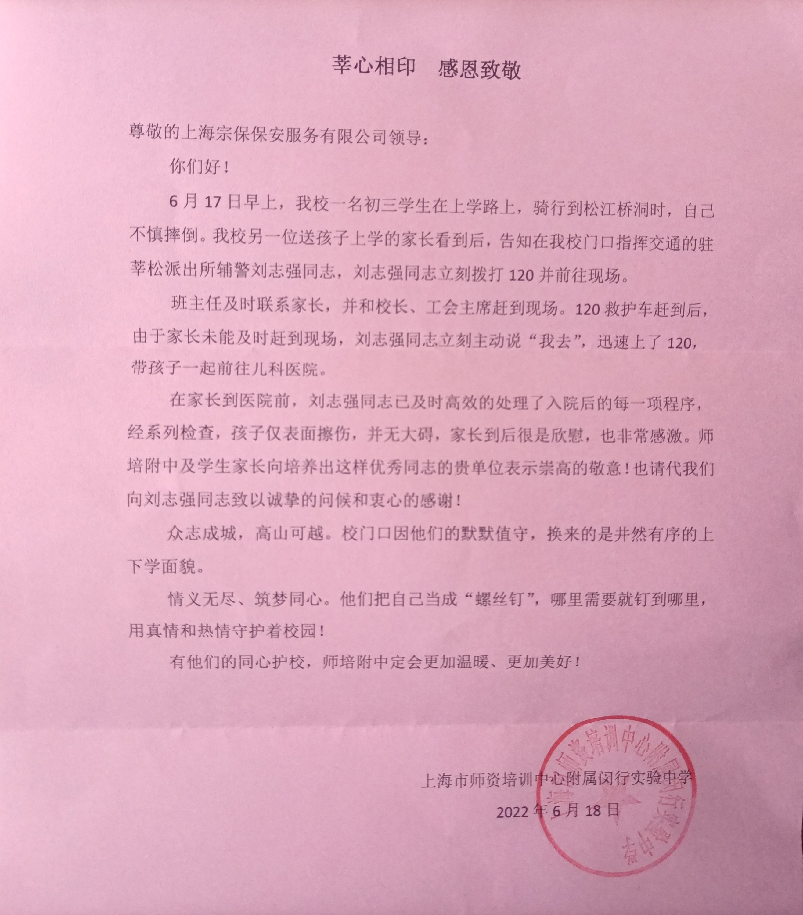 6月18日,宗保公司駐莘松派出所項目員工劉志強收到閔行實驗中學送來的一面繡有“警德高尚 仁心助民”的錦旗和一封感謝信,衷心感謝他護送摔傷學生就醫(yī)的行為。
