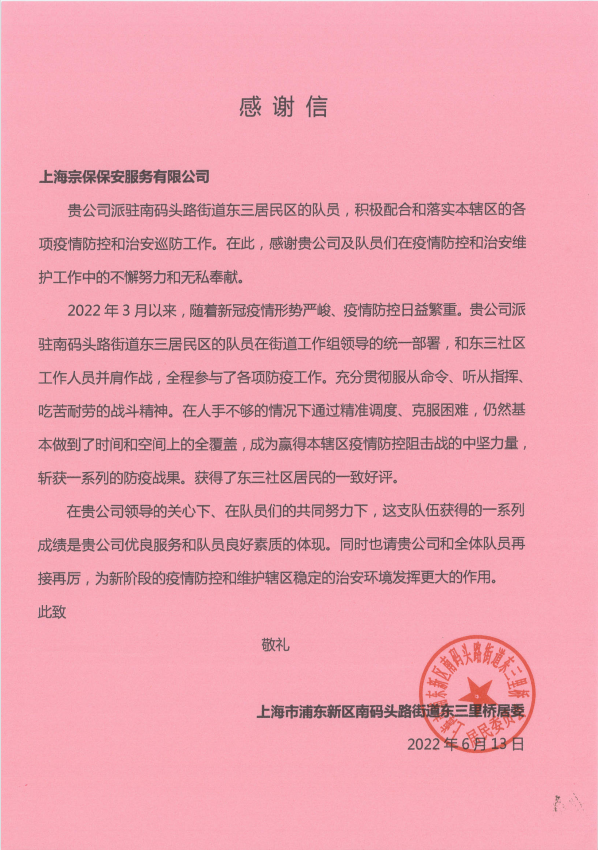 一面錦旗、一封感謝信,見證了宗保員工共克時艱、抗擊疫情的風(fēng)采,展現(xiàn)了宗保員工同心同德、勇往直前的擔(dān)當(dāng)。在常態(tài)化疫情防控形勢下,宗保員工將再接再厲、持續(xù)努力,以更加扎實的工作作風(fēng)、更加認(rèn)真的工作態(tài)度、更加嚴(yán)格的工作要求,配合開展好社區(qū)居委的疫情防控工作,為助力筑牢東三里橋疫情防控屏障貢獻自己的力量。